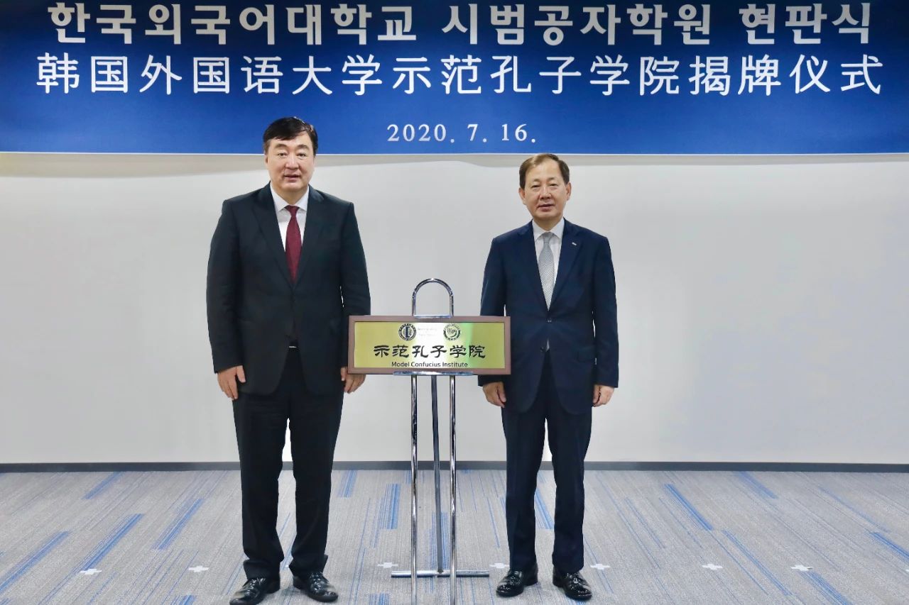 7月16日,韩国首家示范孔子学院在韩国外国语大学揭牌。中国驻韩国大使邢海明、韩国外国语大学校长金仁喆、韩国孔子学院联席会会长金铉哲、中日韩合作秘书处副秘书长姜度好出席揭牌仪式,中国国际中文教育基金会副理事长、秘书长赵灵山和北京外国语大学校长杨丹通过视频致贺。