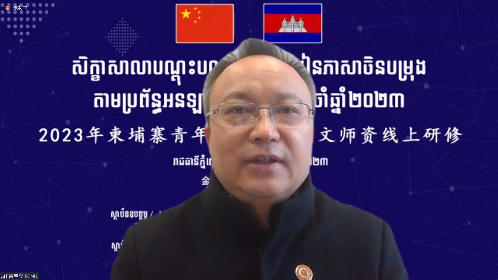 雷启立代表华东师范大学对给予本次培训大力支持的中外语言交流合作中心、中国驻柬埔寨大使馆、柬埔寨皇家科学院致敬,向筹备组织本次活动的一线工作人员表示感谢,对于积极参加本次线上培训的柬埔寨本土中文教师表示热烈欢迎。他指出,华东师范大学是一所以教师教育为特色且专业领先的综合性研究大学,拥有完整的国际中文教育人才培养体系。为更好落实中文纳入柬国民教育体系相关具体工作,华东师范大学愿与柬方亲密合作,共同为持续推动柬本土中文师资队伍建设而努力。