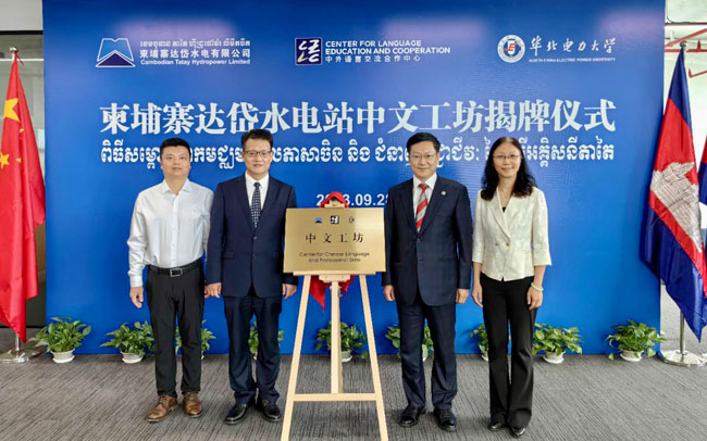9月28日,华北电力大学与中国重型机械有限公司合作成立的柬埔寨达岱水电站中文工坊揭牌仪式在柬埔寨首都金边顺利举行。中外语言交流合作中心副主任胡志平、中国驻柬埔寨使馆公使衔参赞赵海燕、华北电力大学副校长毕天姝、中国重型机械有限公司柬埔寨达岱水电站副总经理王珏出席活动并致辞。