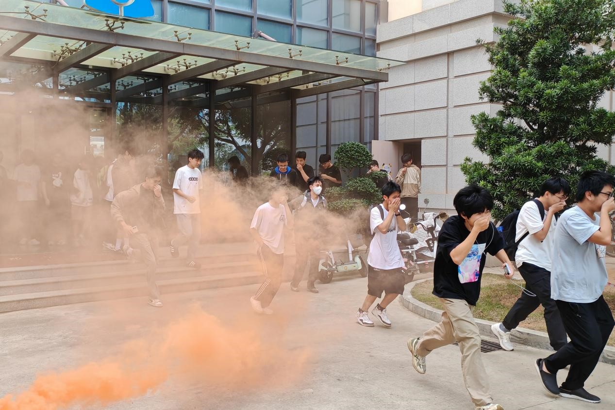 下午13:30,随着尖锐的警报声响起,烟雾弹也同步释放,滚滚浓烟瞬间弥漫在南存钿楼各处,模拟火灾场景。面对这一紧急情况,同学们迅速做出反应,沉着应对,按照疏散路线安全有序撤离。