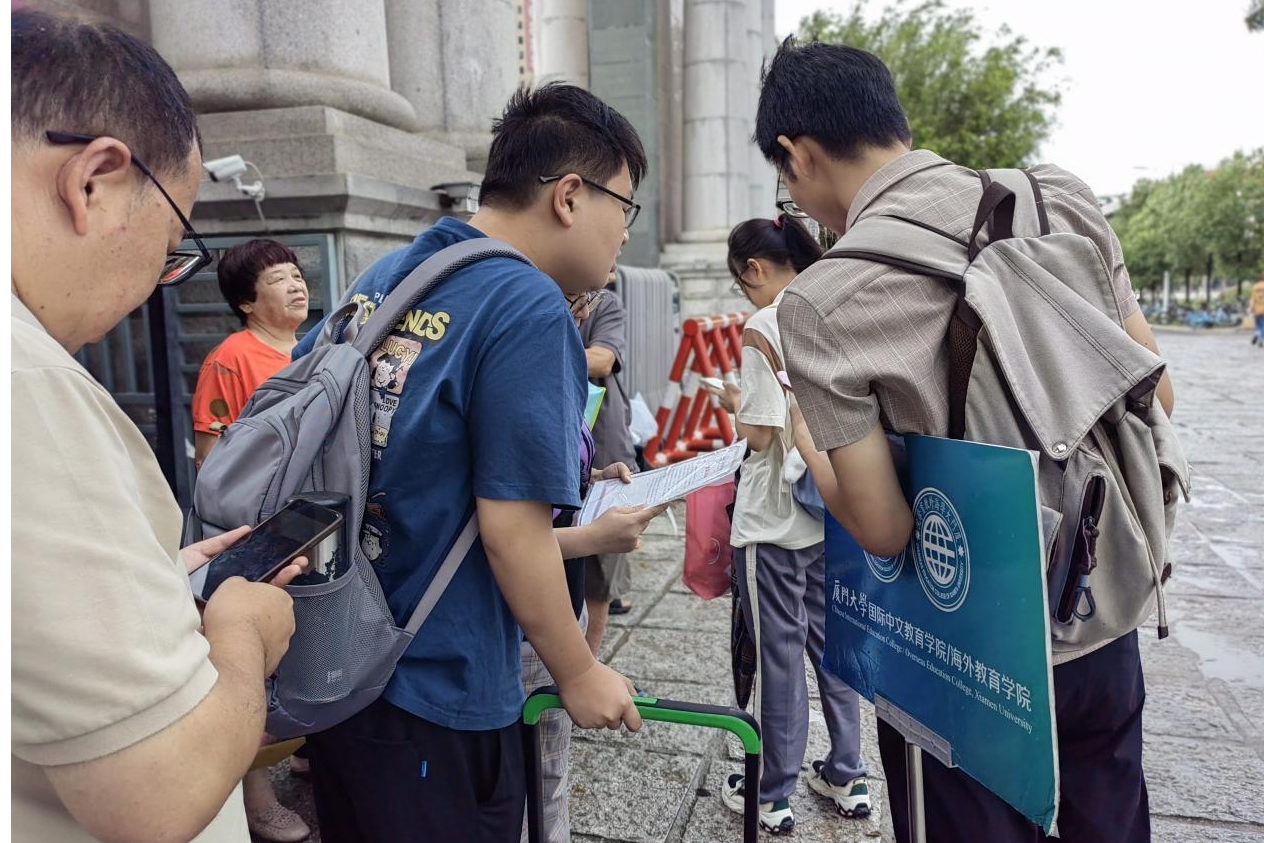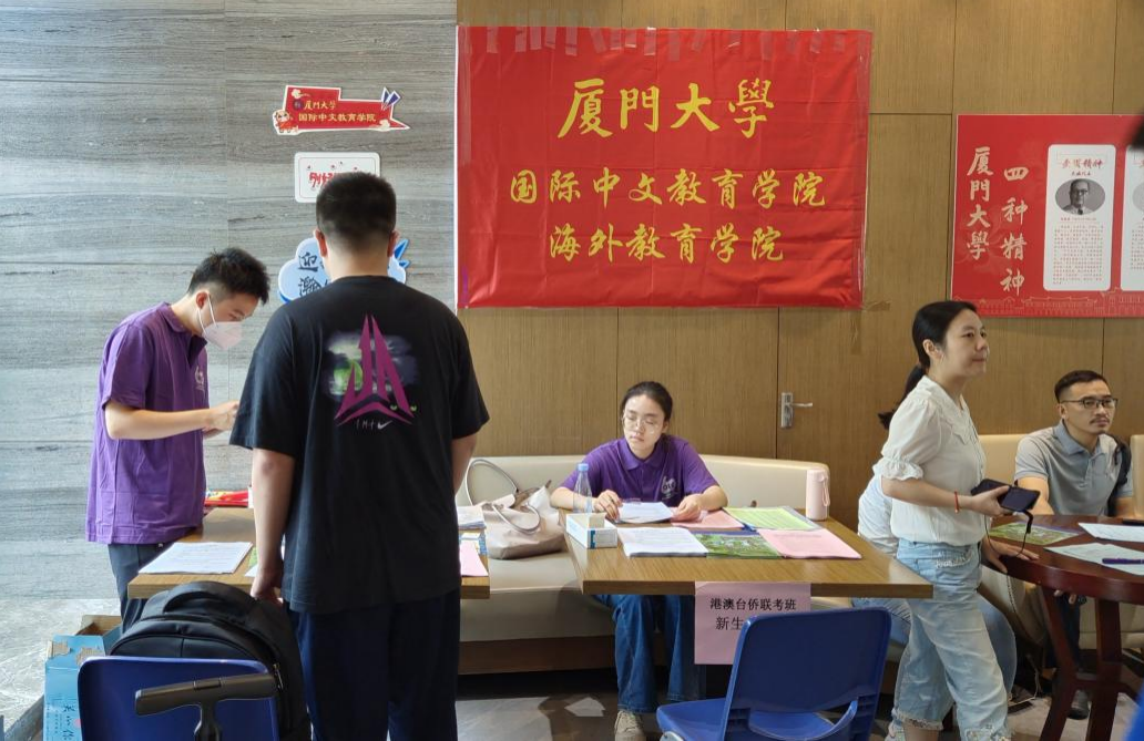 为确保迎新工作顺利开展,学院在暑期就提前做好部署、招募迎新志愿者,做好氛围布置。迎新当天,虽有斜风细雨,却不能阻挡志愿者们热情的心!学院在东门、南一门、五期公寓下车点、院楼、五期国光12及南存钿楼注册报到点均安排了志愿者,他们身着紫色短袖早早上岗,等待联考班新同学的到来。学院党委副书记林明华、港澳台联考班各位老师也来到注册点,与新生家长深入交流,温馨问候前来报道的新生,言语间关怀备至。