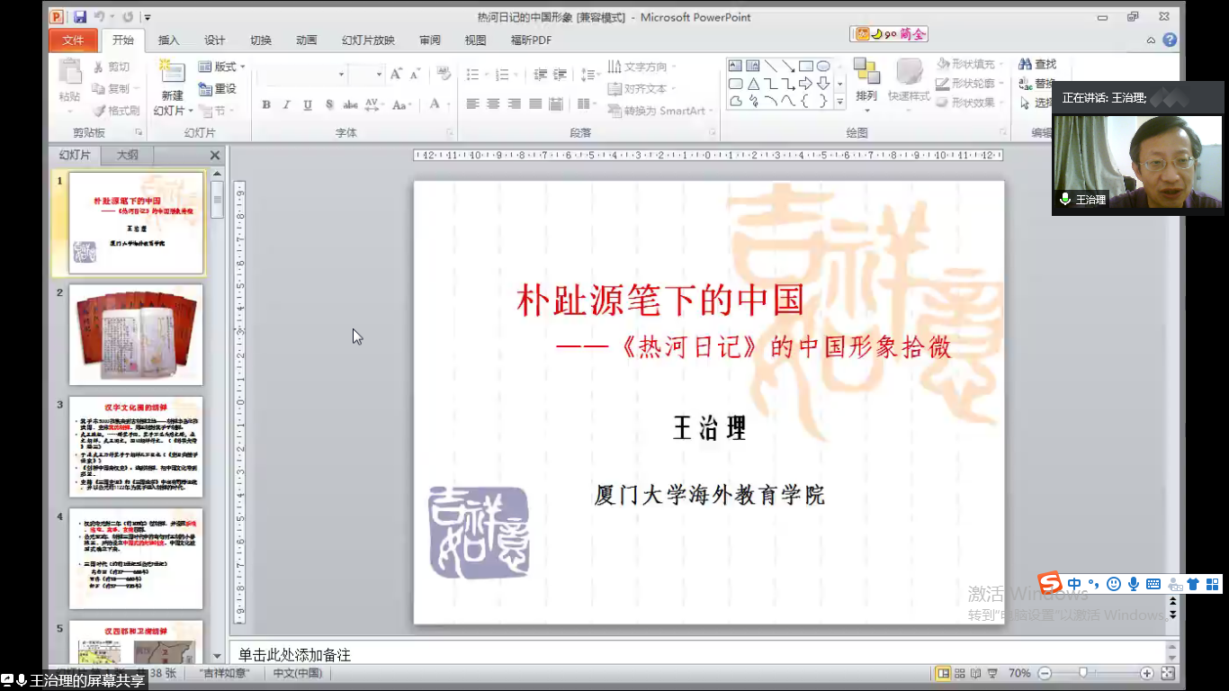 6月4日晚,第213期学术沙龙讲座采用线上的方式成功举办。本次讲座邀请到了王治理老师,主讲内容为朴趾源笔下的中国——《热河日记》的中国形象拾微。