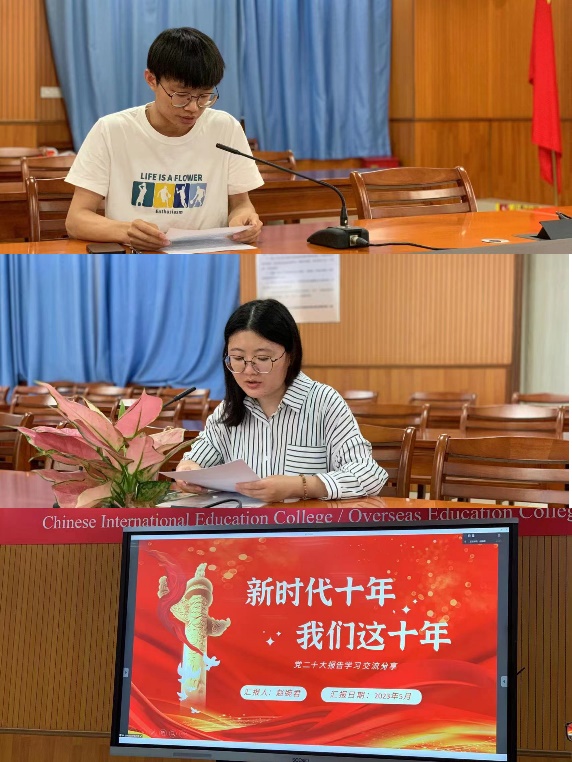支部宣传委员姜立恒就党章的修改进行交流分享。党章的学习是贯彻落实习近平新时代中国特色社会主义思想的重要组成部分,姜立恒结合历次党的代表大会对党章的修改、形势的变化等,对于党的二十大中新出台的党章的部分内容进行了说明,并结合自身谈到党章的学习是一生的必修课,要修常炼,常悟常进。组织委员张骏分享了学习《习近平著作选读》中关于“文明”与“文化”有关论述的收获。她结合总书记关于文化交流互鉴的许多重要讲话,以文化多样性、自身专业特色等视角展开,带领大家重温了总书记的论述内容,激励各党员勇担文化传播的时代重任。支部党员赵婉君做了题为《新时代十年,我们这十年》的分享汇报,她结合自身家乡的点滴变化以及党的二十大报告中关于新时代十年伟大变革的重要表述,带领支部党员在理论和身边具体实践中凝聚思想伟力。