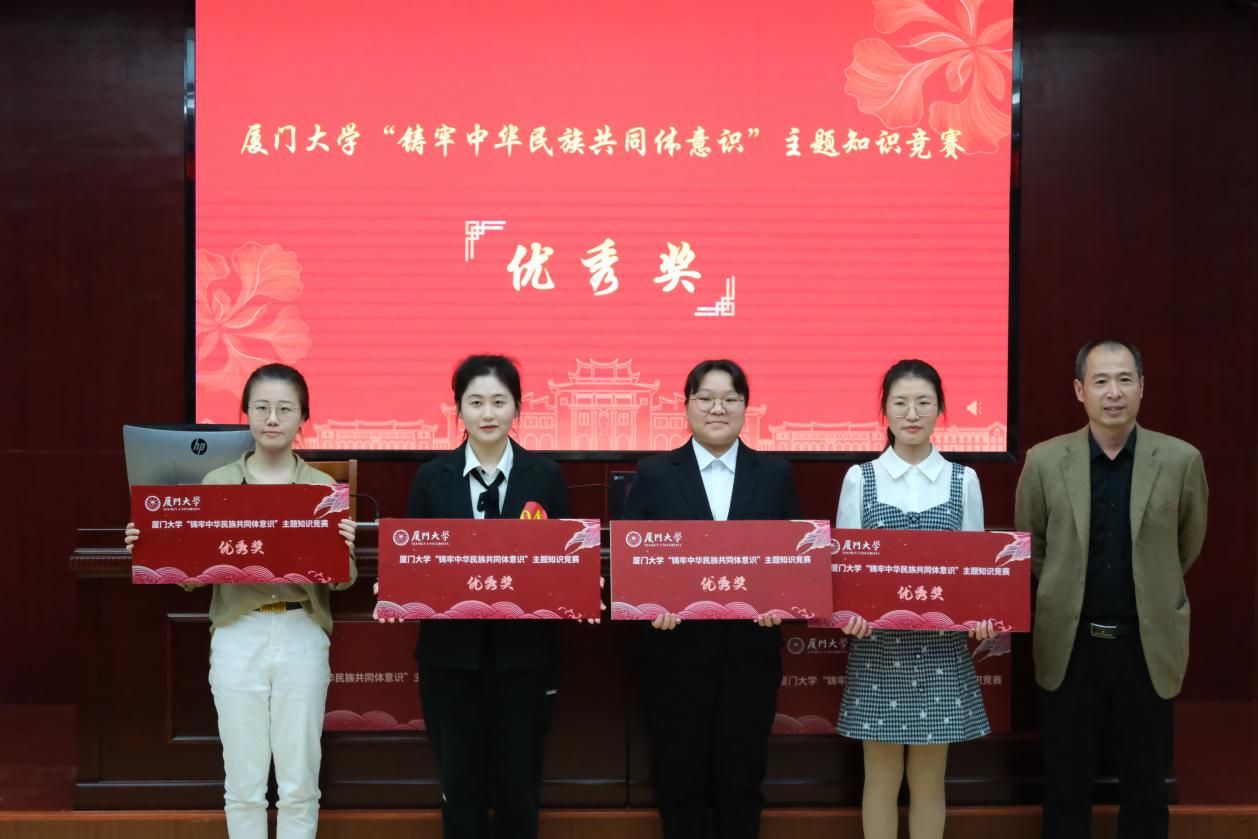 为引导广大学子增强民族团结意识,以实际行动响应党的二十大报告中“以铸牢中华民族共同体意识为主线,加强和改进党的民族工作”的伟大号召,3月25日下午,由我院2022级研究生杨春、段若琳、马璇组成的“榴实登科”队参加了厦门大学首届“铸牢中华民族共同体意识”主题知识竞赛决赛,最终获得优秀奖。