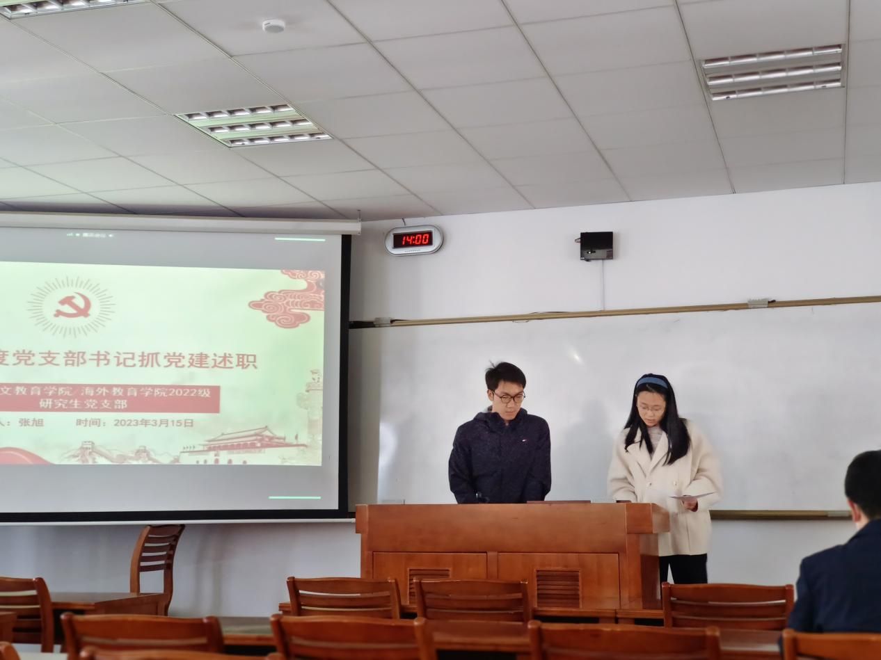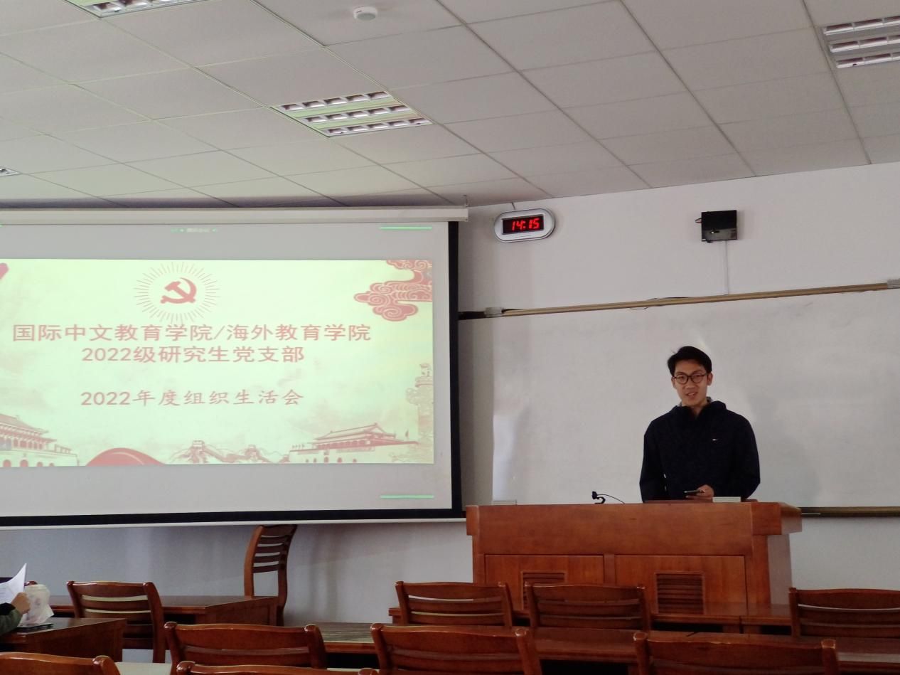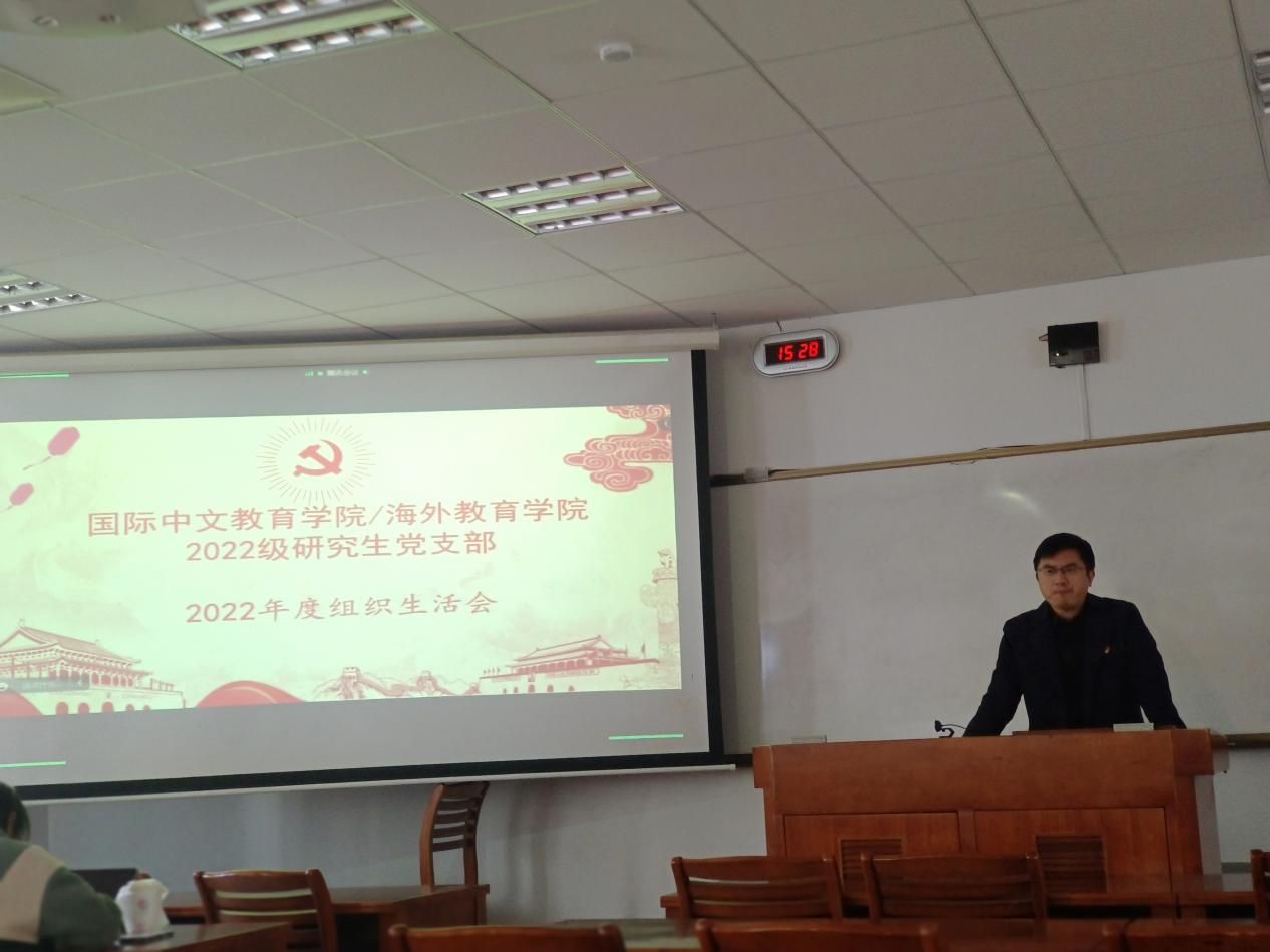 为深入学习贯彻党的二十大精神,增强党组织的政治功能和组织功能,深化支部作风建设,3月13日下午,国际中文教育学院2022级研究生党支部于坤銮楼B211教室开展组织生活会暨民主评议党员大会,会议由支部书记张旭主持,支部全体党员参加会议,学院党委副书记林明华到场指导。