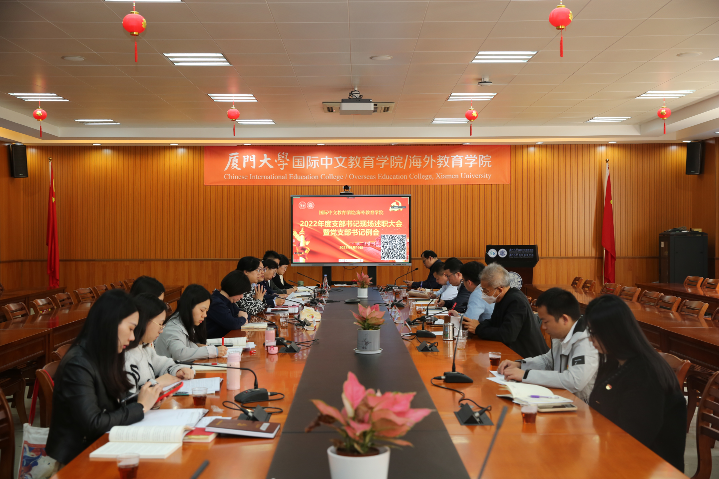 3月15日上午,国际中文教育学院/海外教育学院在翔安校区坤銮楼C104召开2022年度党支部书记述职评议会,校党委教师工作部副部长伍伟平到场指导,学校基层党建工作联络员郑冰冰应邀线上出席会议。学院党委委员、各党支部书记参加会议,支部委员列席会议。会议由学院党委书记范丽主持。