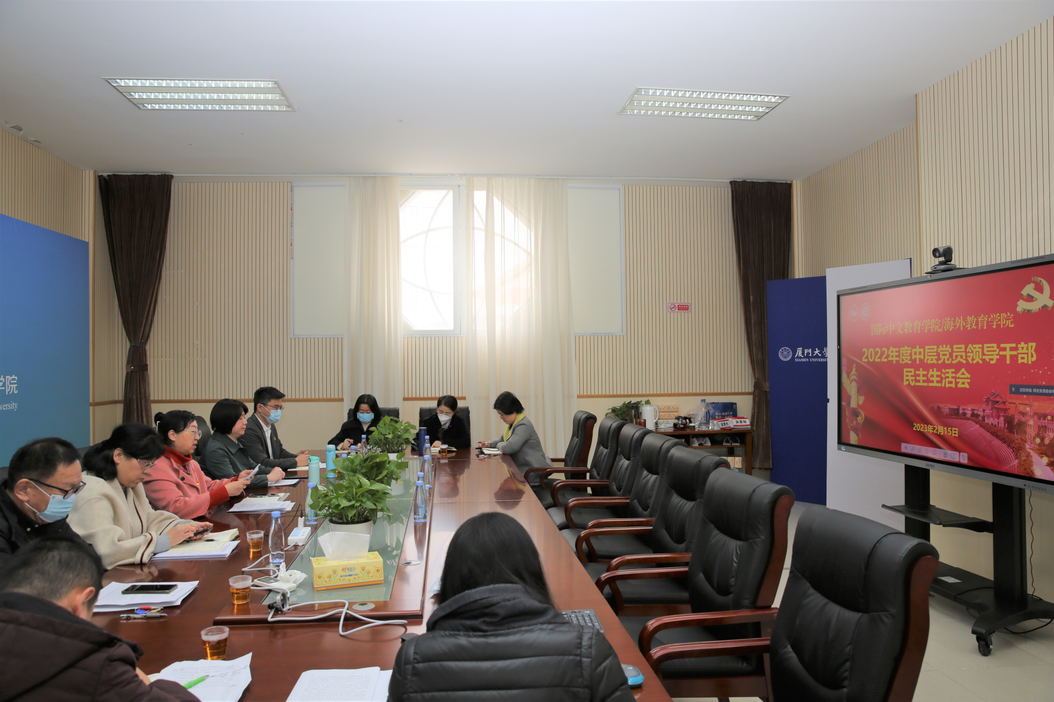 2023年2月15日上午,国际中文教育学院/海外教育学院2022年度中层党员领导干部民主生活会在翔安校区坤銮楼B509会议室召开。会议由学院党委书记范丽主持,学院领导班子成员参加,华文系副主任郭建花、孟繁杰、语合中心副主任何冬梅、办公室主任洪伟、工会副主席秦晶晶列席了会议。校基层党建联络员、民主生活会第四督导组组长郑冰冰线上参会指导并点评。