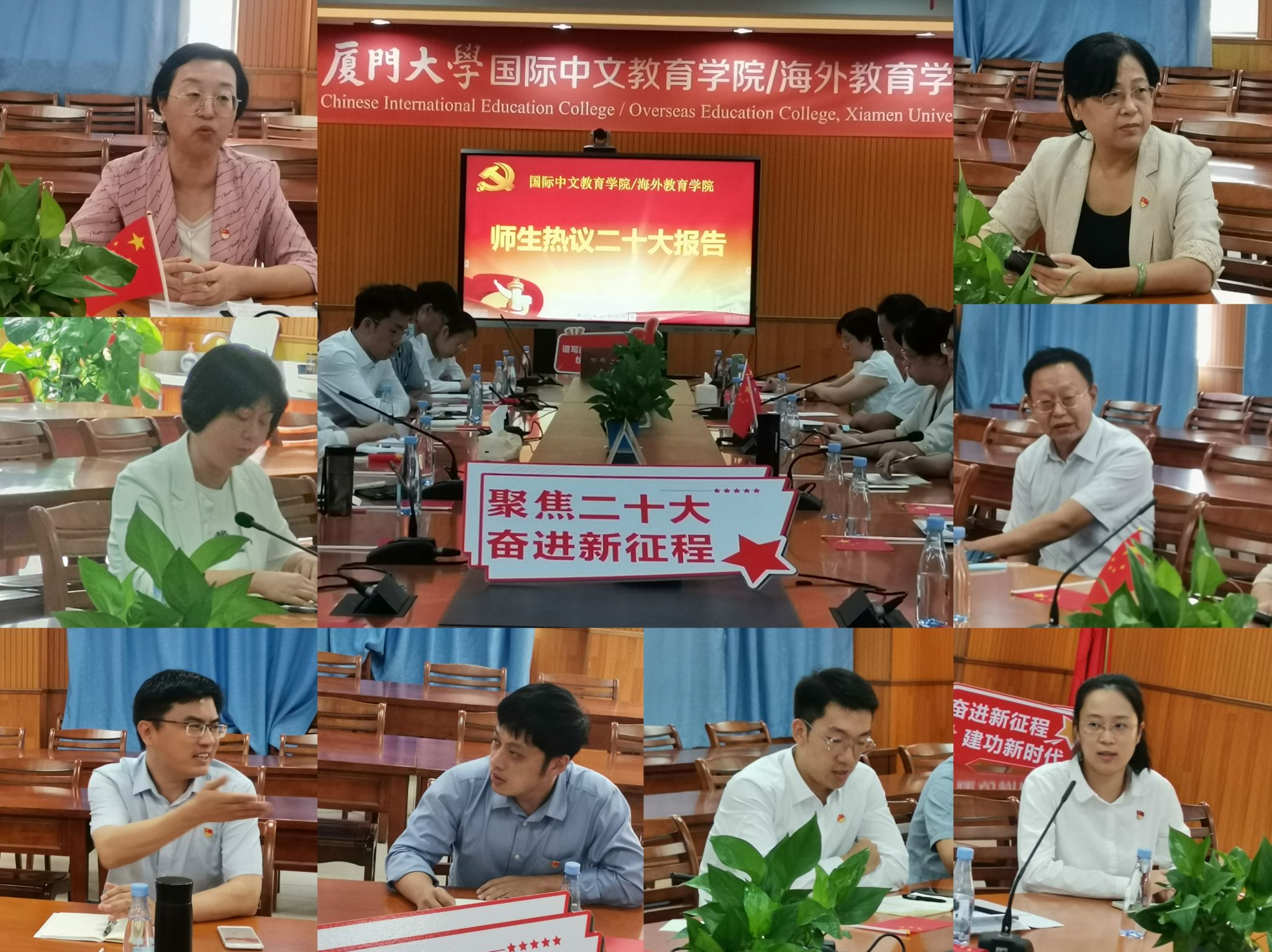 院长陈志伟谈到,总书记在报告中指出,我们要增强中华文明传播力影响力,推动中华文化更好走向世界。学院作为国内最早专门从事海外教育的机构,是我校中华文化走向世界的重要平台。站在新起点,我们要牢记总书记嘱托,发挥学校深厚文化底蕴,抓住国际中文教育发展新机遇,力争为国家培养更多具有传播能力、全球视野和国际竞争力的新时代人才,积极讲好中国故事,传播好中国声音,展现可信、可爱、可敬的中国形象,为中华文化走向世界提供厦大力量,为实现文明互通互鉴,世界美美与共,构建人类命运共同体贡献厦大智慧。
