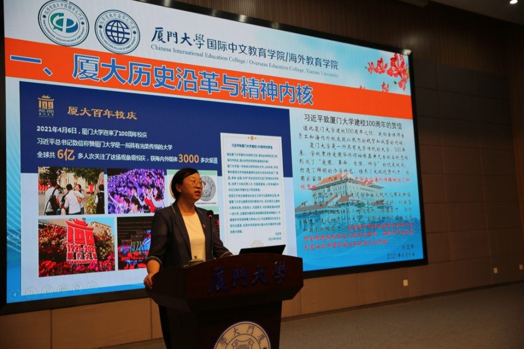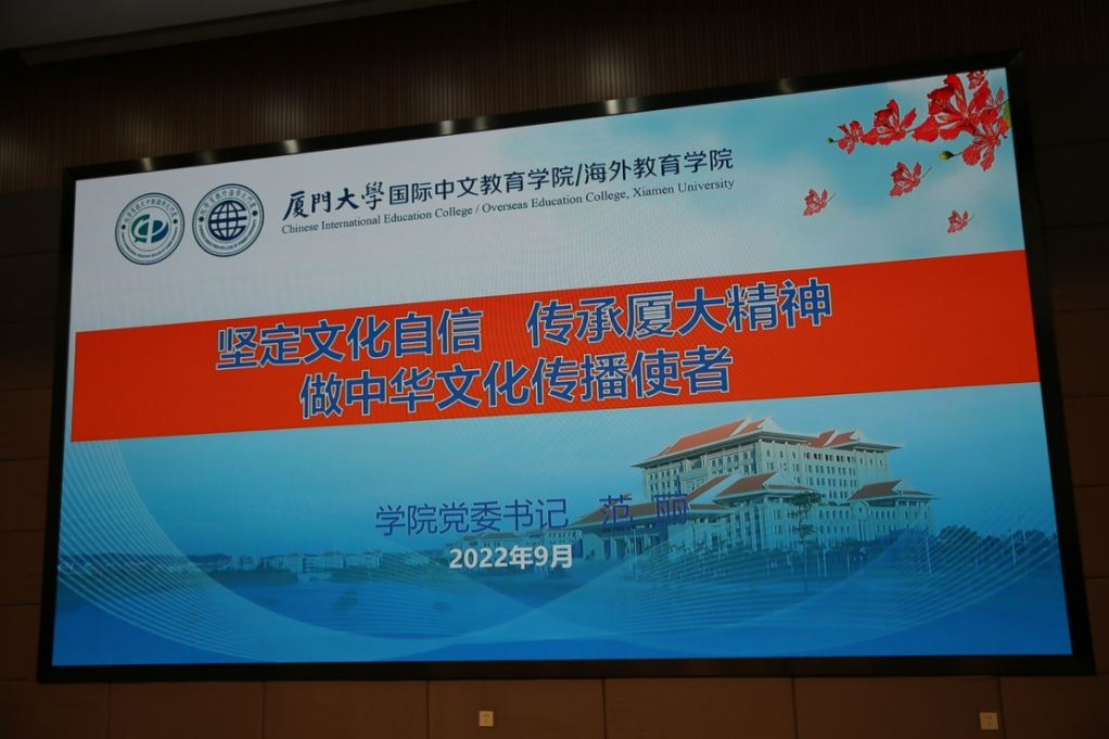 春去秋来,金风送爽,2022年9月16日上午,在厦门大学国际中文教育学院/海外教育学院2022级新生开学之际,学院党委书记范丽在德旺图书馆二号会议厅,以《坚定文化自信 传承厦大精神 做中华文化传播使者》为题,为全体国内研究生新生生动讲授了开学第一堂党课。范丽从厦大历史沿革与精神内核,学院的历史与特色,坚定文化自信、传承厦大精神、做中华文化传播使者三个方面进行讲授,旨在帮助新生梳理厦大辉煌的历史征程、提炼百年厦大的精神内核,力求以信仰之力滋养青春理想,助力中华文化的国际传播。