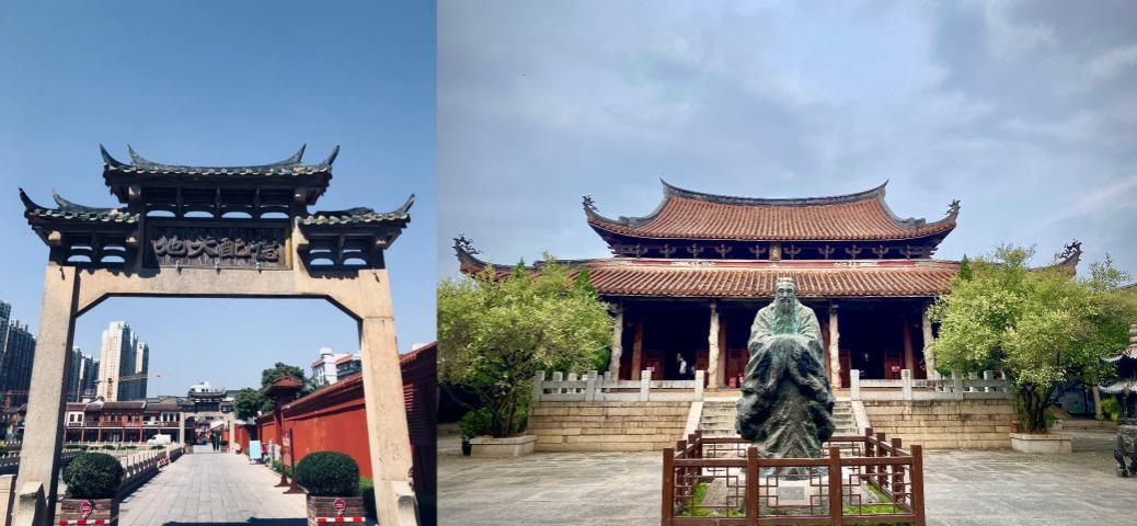 29日上午,实践队首先考察了漳州府文庙。文庙坐落于漳州市芗城区修文西路,始建于北宋庆历四年(1044年),是国家级重点文物保护单位。漳州文庙坐北朝南,门南左右两方分别立着刻有“道冠古今”“德配天地”的木制牌坊,气势宏伟地守护着漳州文庙的神圣与庄严。木制牌坊的古朴,散发着儒家学说的亲民气息;宏伟高大的牌坊让民众心生敬仰。