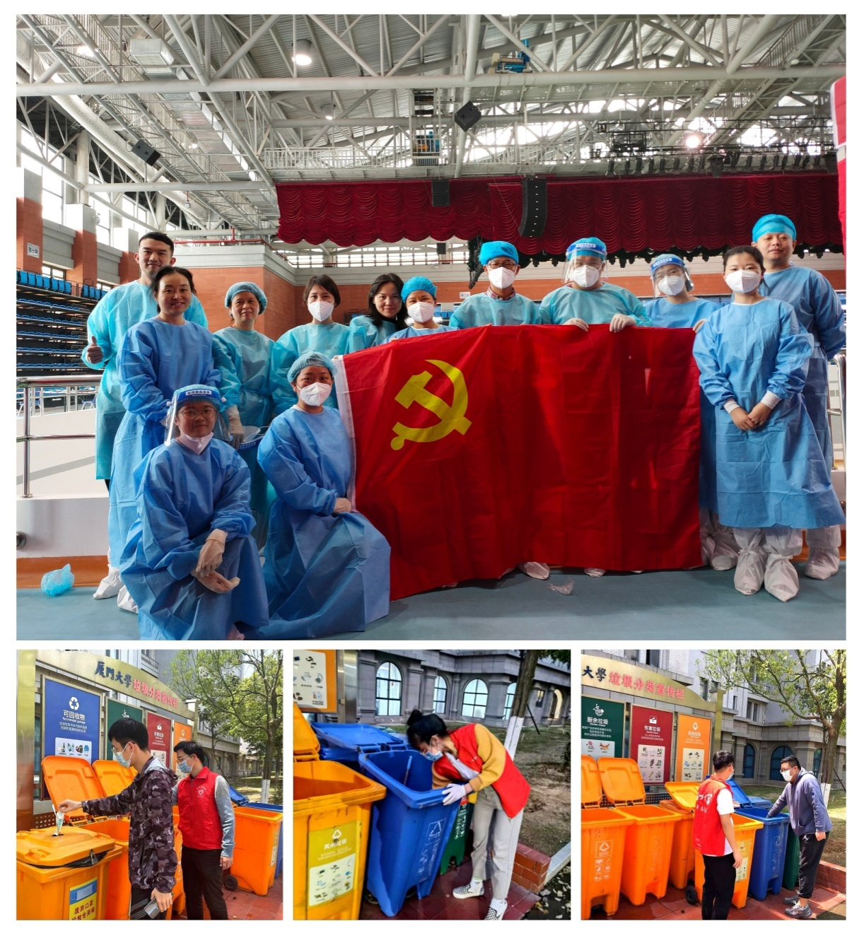 图为 师生党员活跃在校区核酸检测、“一站式”学生社区以及督导垃圾分类的现场