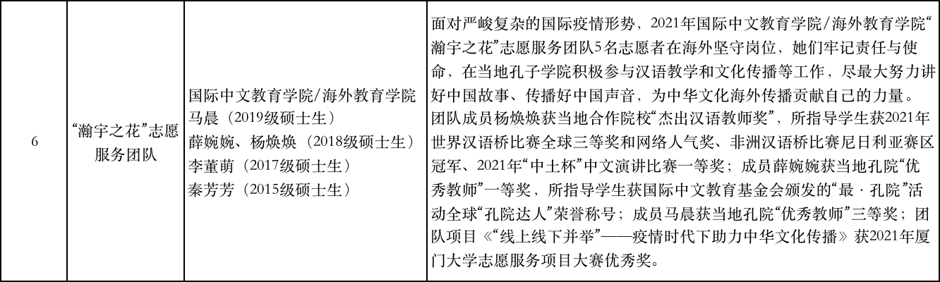 近日,厦门大学对2021年1月以来在创新竞赛、学术研究、疫情防控、社会实践、志愿服务等领域取得优异成绩的团队及个人进行通报表扬,国际中文教育学院/海外教育学院“瀚宇之花”志愿服务团队作为16个团队之一,获得本次通报表扬。
