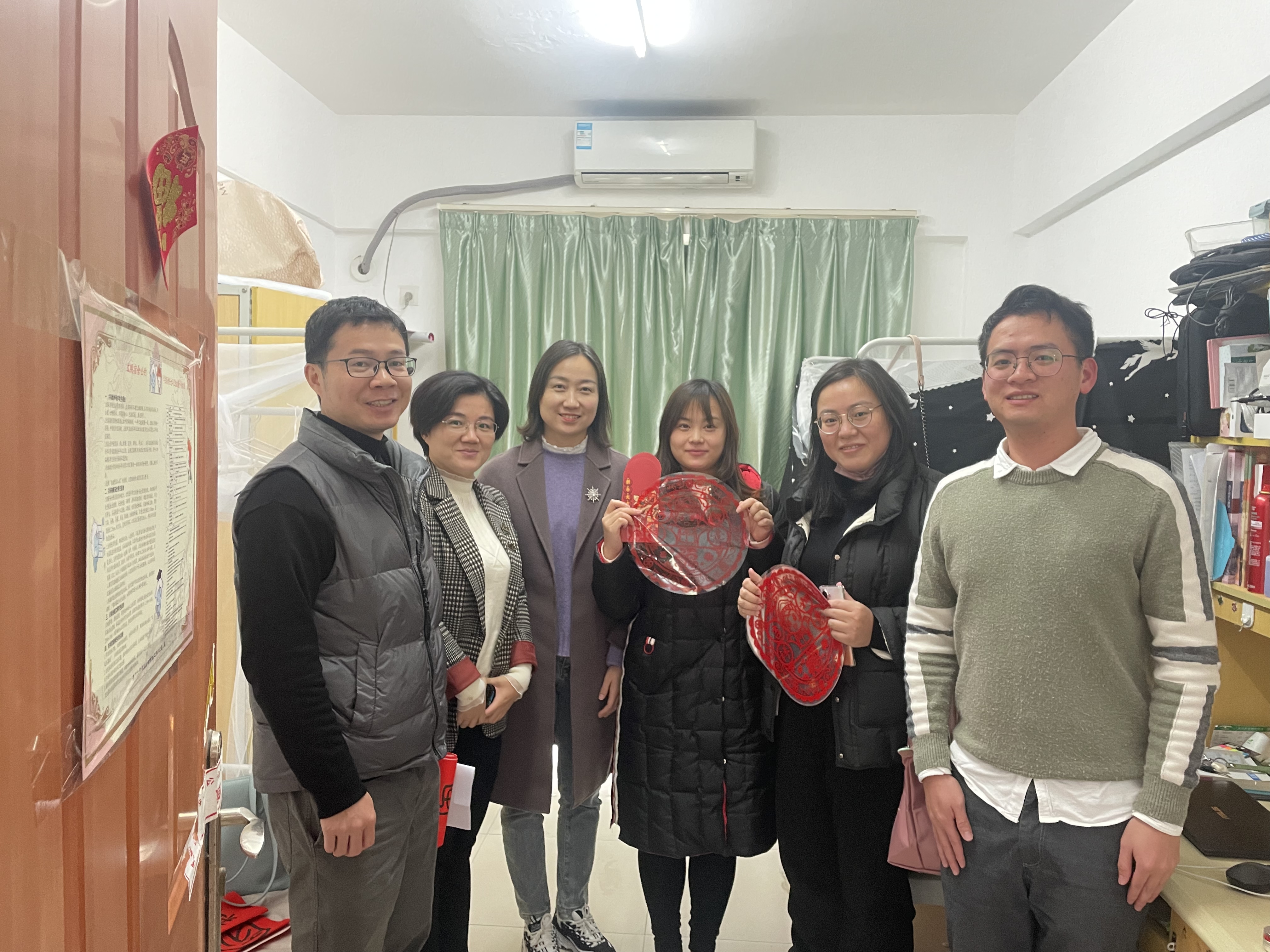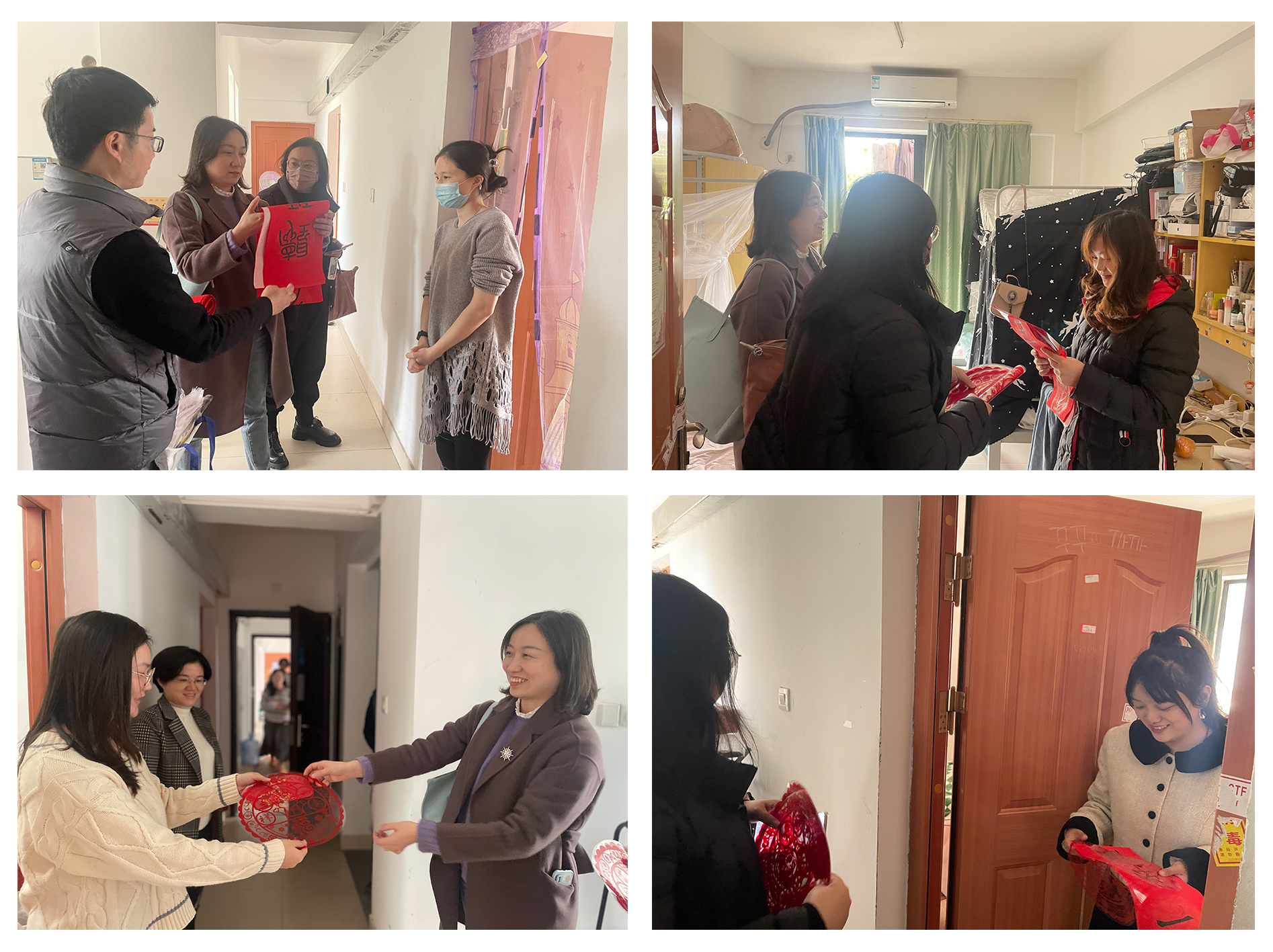 假期新启,新春将临。为加强对留校学生的安全教育,确保留校学生度过一个平安健康、充实而有意义的寒假与春节,1月17日下午,国际中文教育学院/海外教育学院党委副书记吴荻、中外语言交流合作中心副主任及“一站式”学生社区兼职辅导员何冬梅,以及团委书记陈艺新、辅导员关丽文,走访慰问了我院寒假留校学生,并送上新春祝福,发放春联、窗花等节日小礼包。