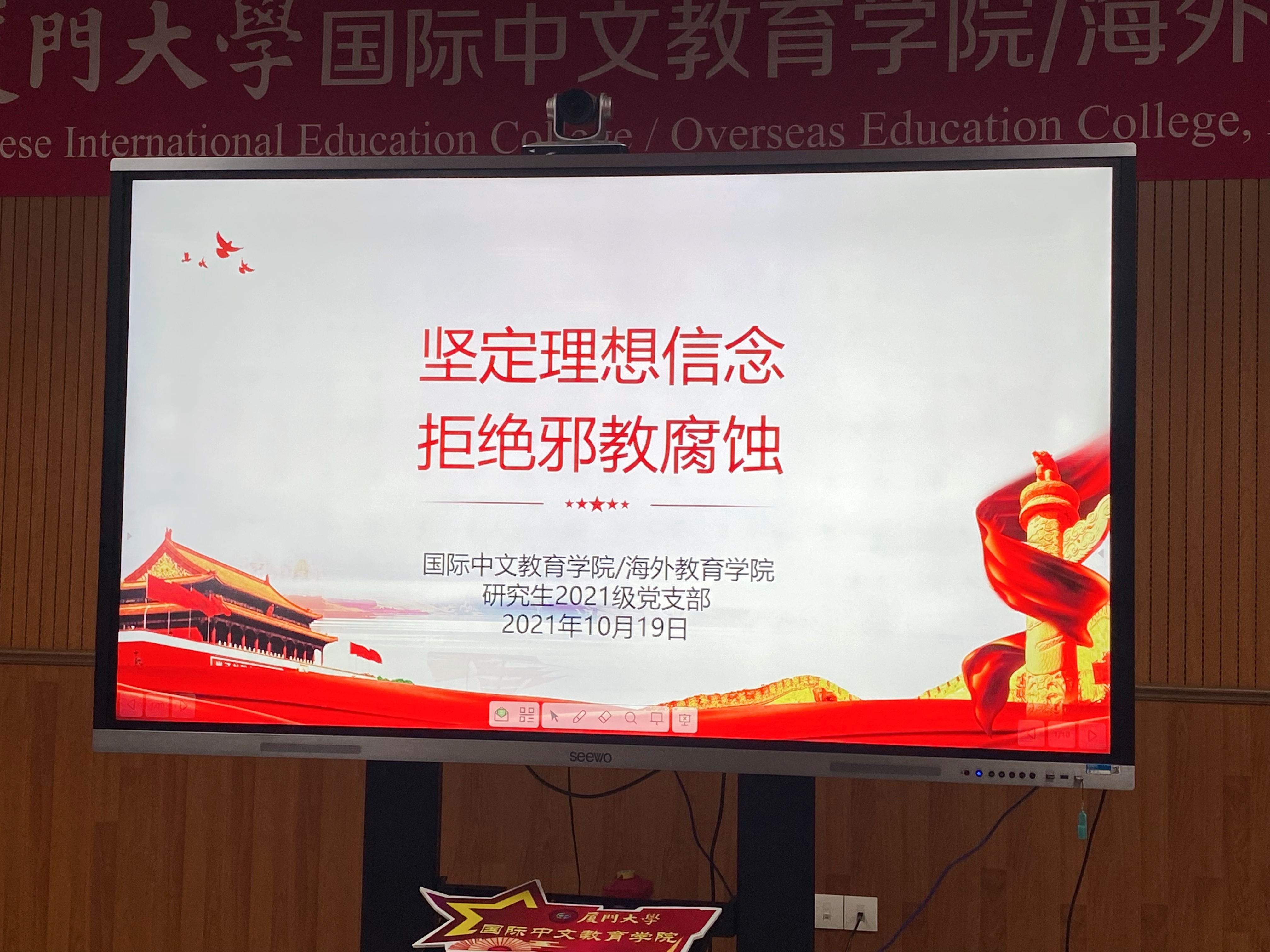 为了建设和谐校园,净化校园环境,拒绝邪教腐蚀,2021年10月19日下午,厦门大学国际中文教育学院/海外教育学院研究生2021级党支部在坤銮楼C104开展了主题为“坚定理想信念,拒绝邪教腐蚀”的反邪教宣传教育活动。