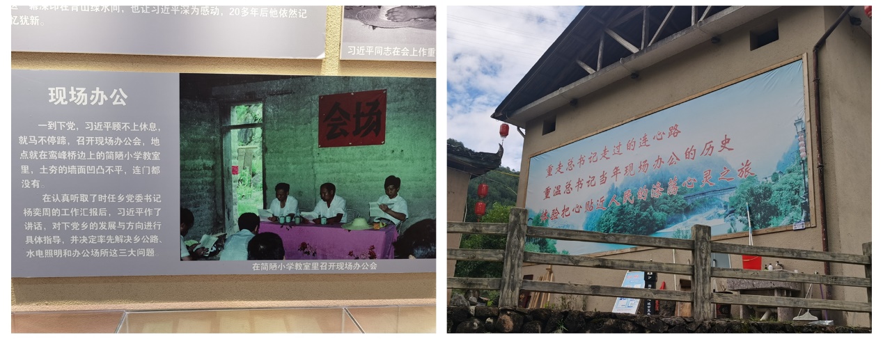 (图为标语和展馆内的总书记首次到下党的现场办公展示)
