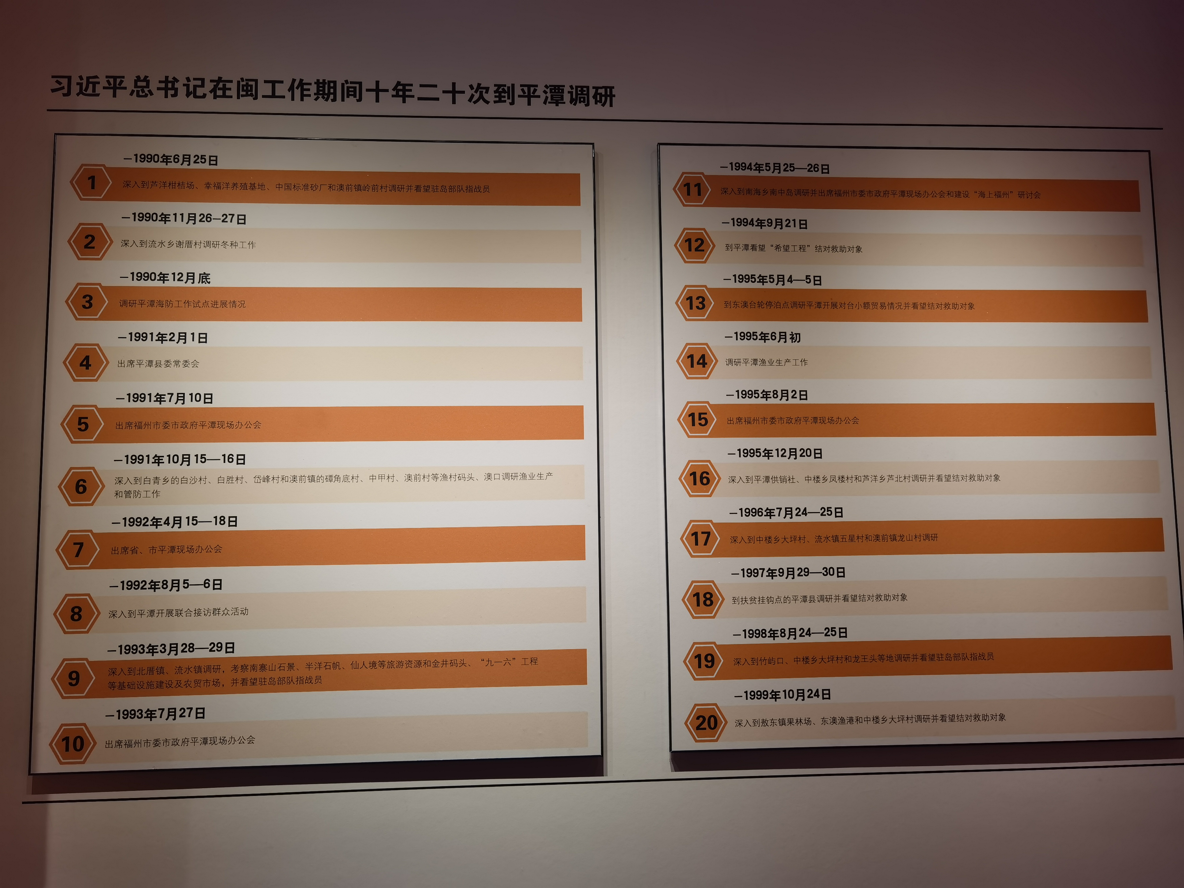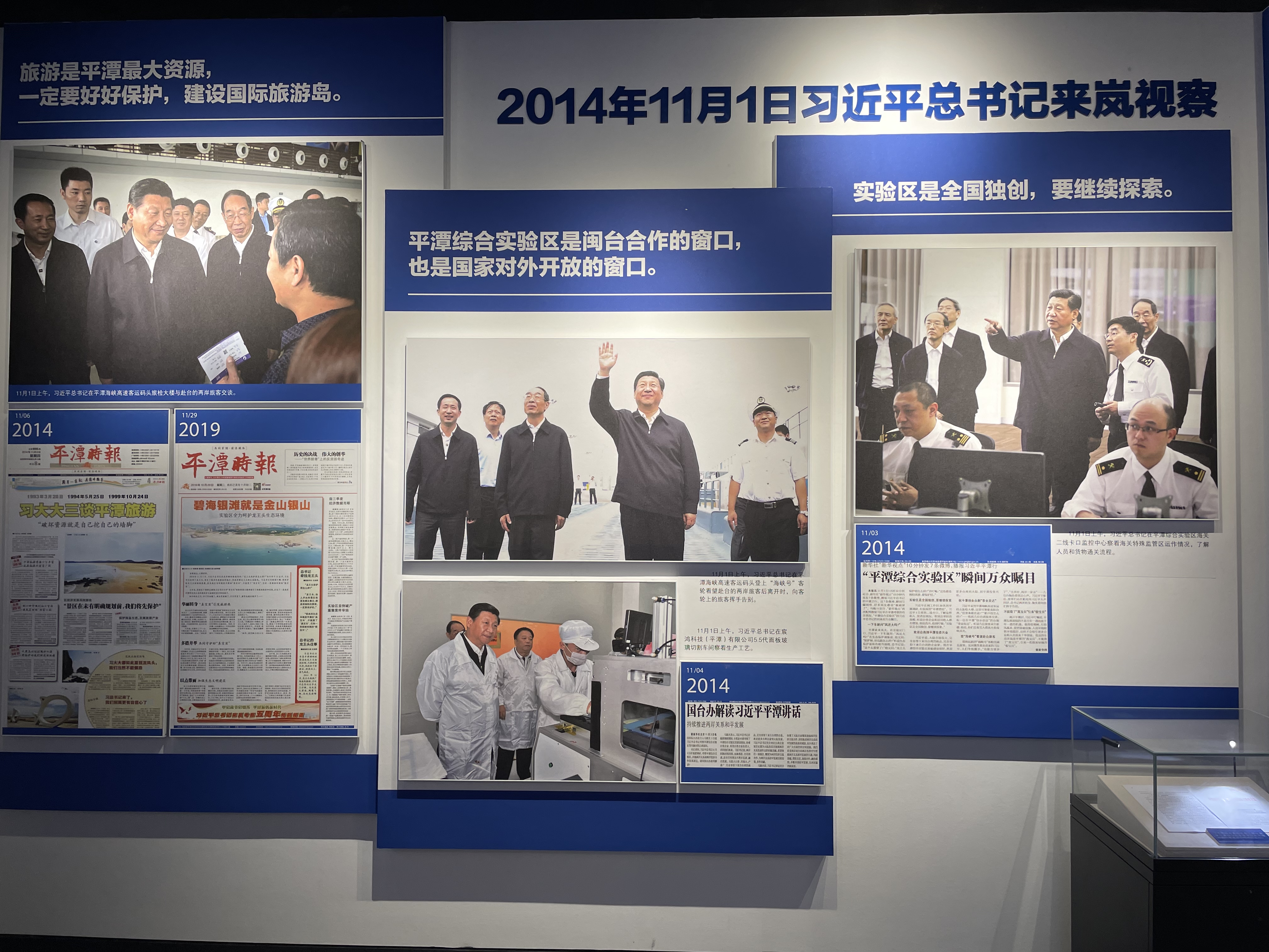 进入党日馆序厅,迎面而来的严便是“不忘初心、牢记使命”八个大字,在白墙中从左到右勾勒出平潭海洋捕捞、隧道挖掘等场景,一楼展厅以时间为主线,以海坛烽火、岚岛新天、平潭浪涌三个篇章,系统展示了从1921年至今,平潭在党的领导下,开展革命斗争、经济建设、开放开发所取得的辉煌成就。在“海坛烽火”中,展示了1921-1949年间平潭的革命历程,包括系列战争状况、六次光复、两次解放、以及所涌现出的曾焕乾、周裕藩、刘伯华等革命烈士的相关内容;“岚岛新天”中讲述了自新中国成立以来在党的领导下,平潭开展打击反动派斗争、巩固人民政权、建设社会主义、开展改革开放所取得的成就,土地房产所有证存根、公民普选的人物雕塑像、各种政策文件等都见证了平潭的飞跃发展,其中还有习近平总书记十年间先后二十次深入平潭基层,促进平潭发展的调研介绍,深刻展示了党中央对于乡村振兴与发展的关心,为人民谋幸福的初心和使命;从“平潭浪涌”中,我们看到自2009年以来至今平潭深入贯彻党中央文件精神,坚持以习近平新时代中国特色社会主义思想为指导,贯彻落实习近平总书记关于平潭工作的重要讲话精神和批示,从“一岛”、“两窗”、“三区”的战略定位着手所开展的一系列举措。
