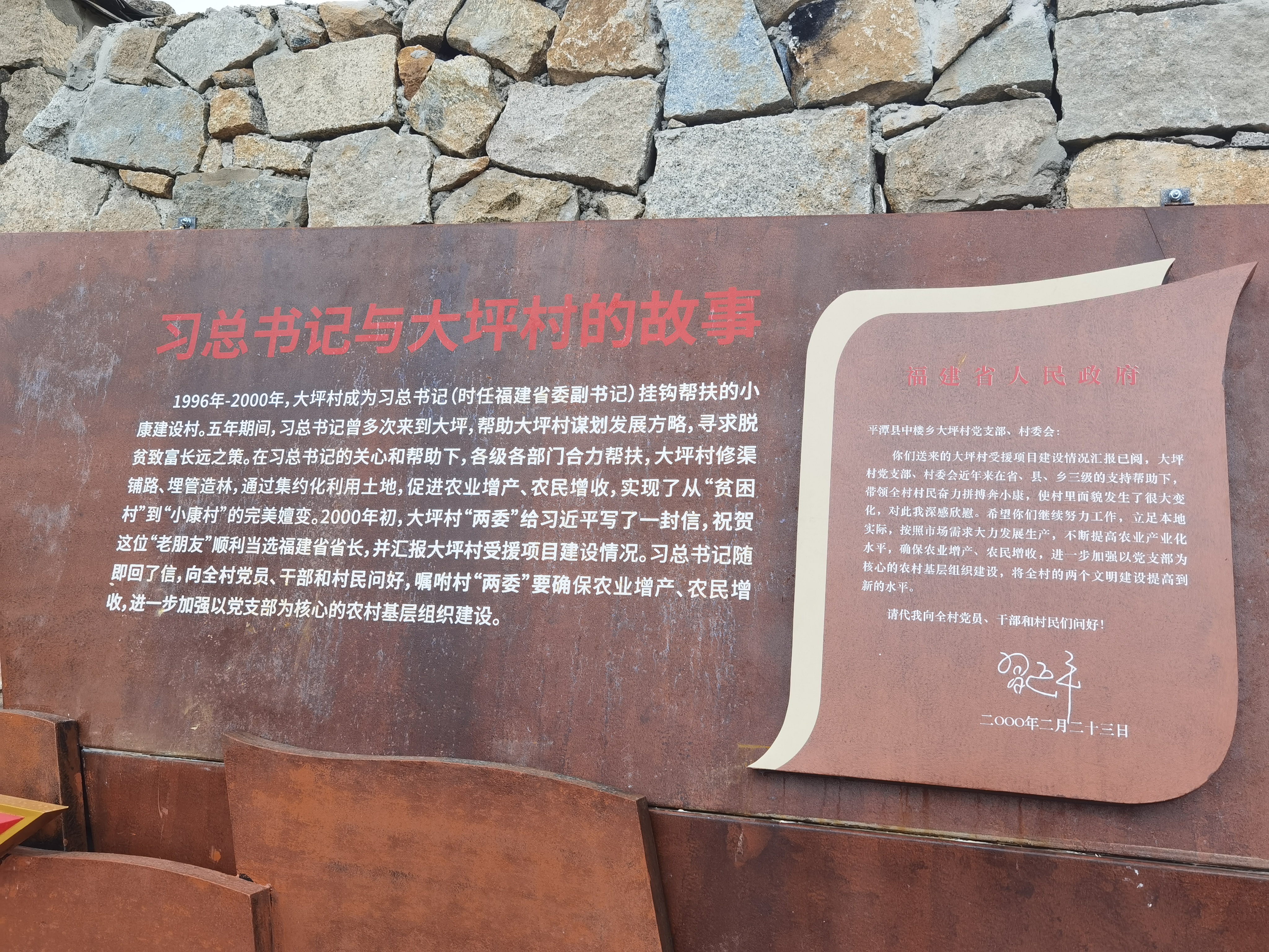走进大坪村,映入眼帘的是一条整洁干净的宽广大路,该主路在十多年前还是泥泞一片,极难行走。根据与村民的交流和村中的资料了解到,1996年习近平总书记(时任福建省委副书记)第一次来到大坪村慰问困难群众,同年即指示交通局拨款大坪村修建道路,村民热情高涨,不仅纷纷自发捐款,而且许多住户都主动拆除自家房屋以便修路,首条公路的修建彻底结束了大坪村祖祖辈辈于泥泞小路上行走的历史。这种精神也代代传承,激发着大坪村村民在全村发展的过程中不懈奋斗。在大坪村主路旁还记载着当时习近平总书记三进大坪村的扶贫故事以及2000年总书记给大坪村的回信,总书记在任福建省委副书记时三进大坪村,分别为道路建设、农业增产、文化生活等做出了重要指示,大力促进了大坪村的发展建设。