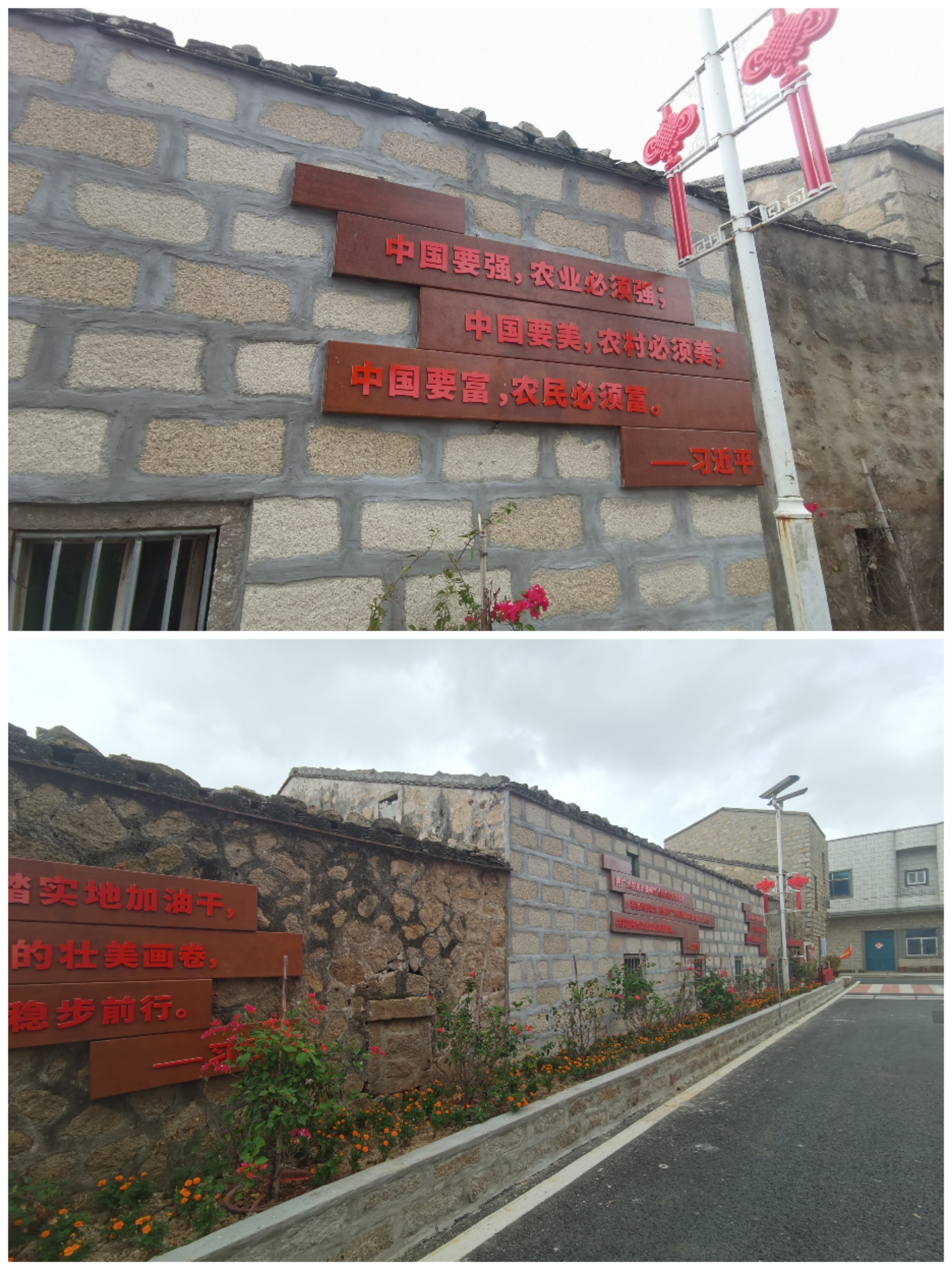 大坪村的村居以红砖和花岗岩结合的石厝为主,特色显著,而在村居的墙上随处可以红色文化的体现,各色学习党史、乡村振兴的标语引人注目。此外其中一面以习近平总书记语录集载的标语墙也相当夺人眼球,充分显示了大坪村紧跟中央号召,不断探索发展,实现乡村振兴的决心,以及切实贯彻党中央政策和精神的发展方向。