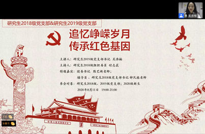 2020年8月11日晚,海外教育学院/国际学院研究生2018级、2019级党支部携手组织开展了以“追忆峥嵘岁月,传承红色基因”为主题的线上党课学习活动。研究生2018级、2019级党支部全体党员、入党积极分子以及2020级的新生共同参与了此次党课学习,学院团委书记陈艺新老师、辅导员钟民栋老师列席会议。此次党课学习活动由研究生2019级党支部书记吴浩楠主讲,研究生2018级党支部组织委员付志晨主持。