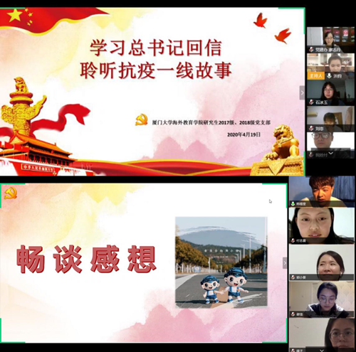 4月19日晚,海外教育学院研究生2017级、2018级党支部联合举办了一场以“学习习近平总书记回信、聆听抗疫一线故事”为主题的线上微党课。校组织部副部长、党建办主任廖志丹,学院党委书记王艺,党委副书记罗俊峰以及多位学院师生党支部委员参加了本次活动。