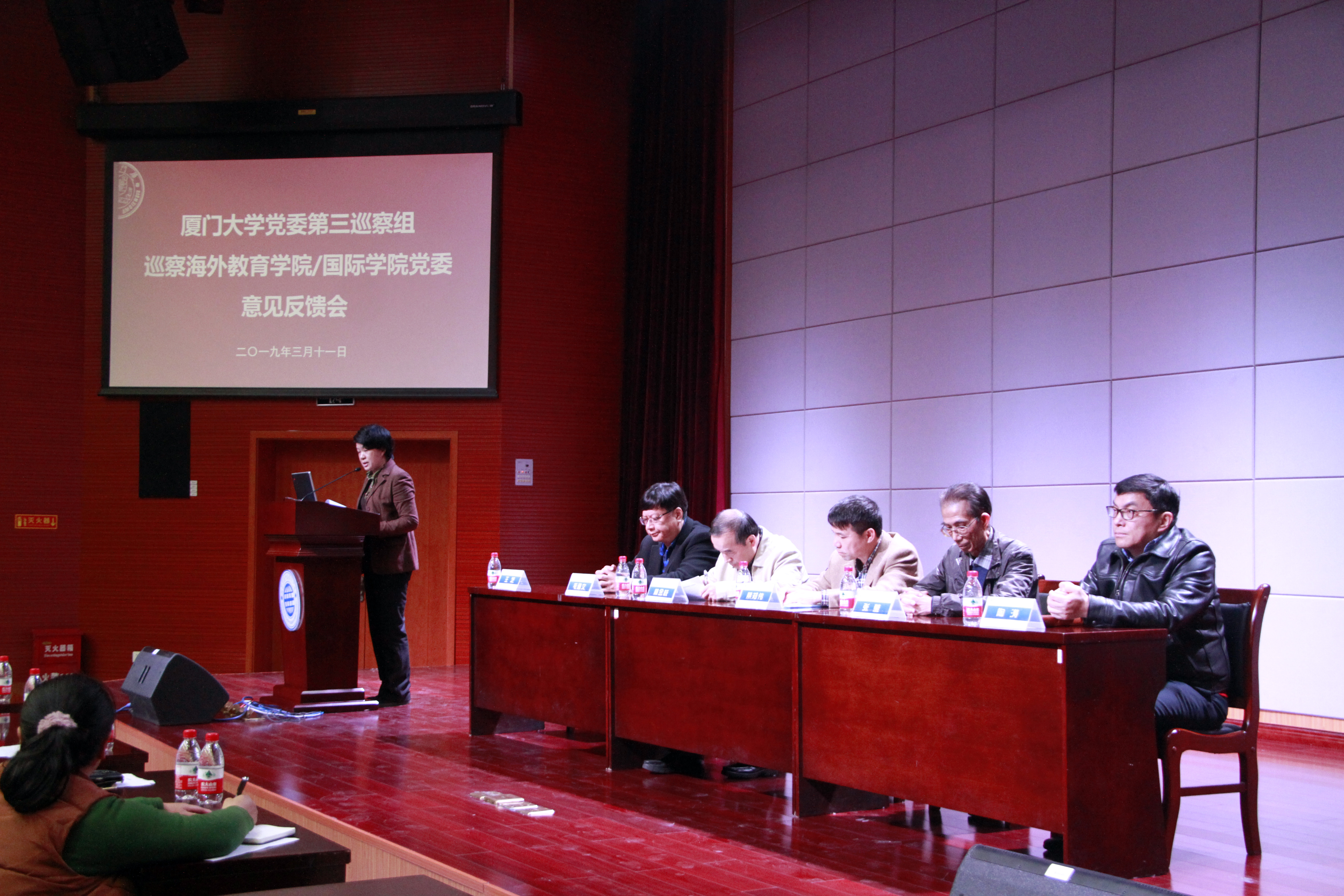 3月11日下午,厦门大学党委第三巡察组巡察海外教育学院/国际学院党委意见反馈会在翔安校区坤銮楼B102多功能厅召开。校纪委副书记、纪委办主任、巡察办主任林金枝,校党委第三巡察组组长、校纪委委员、考试中心主任蔡郑伟,第三巡察组副组长、校纪委委员、汉语国际推广南方基地/孔子学院办公室主任毛通文,第三巡察组副组长、财务处原副处长张莹出席了会议。会议由海外教育学院/国际学院党委书记王艺主持。海外教育学院/国际学院党委领导班子成员、党委委员及全体教职工、部分退休教师代表参加了会议。