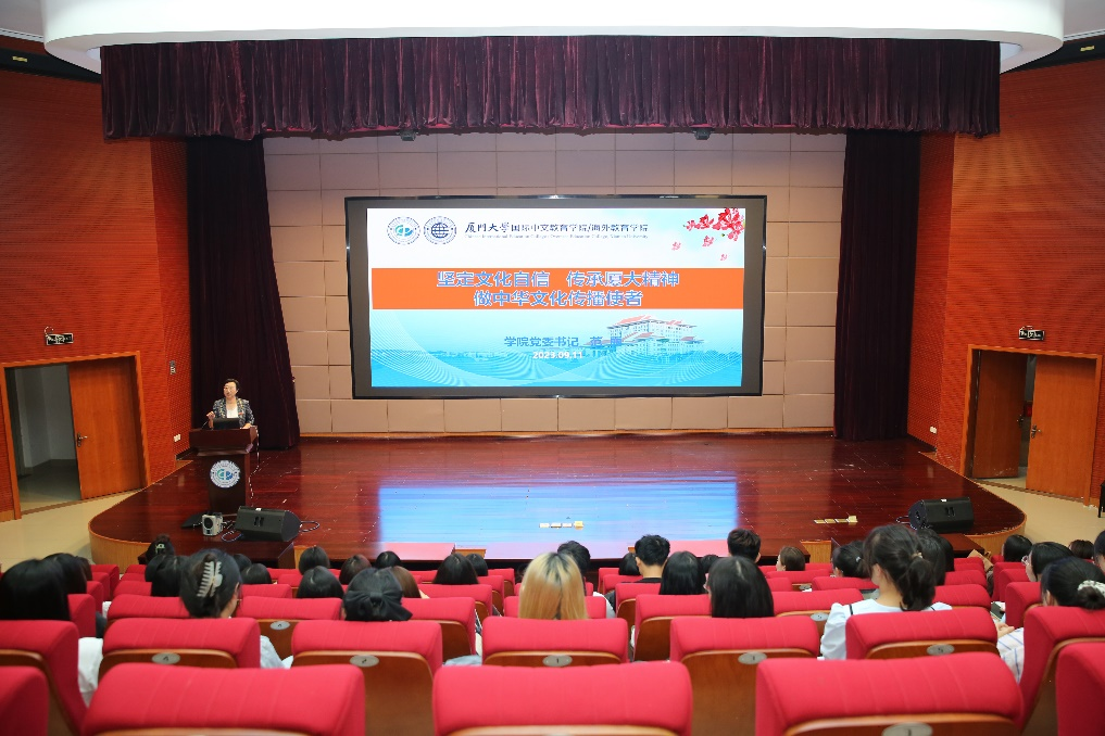 9月11日下午,值新生开学之际,国际中文教育学院/海外教育学院党委书记范丽为2023级硕士研究生新生讲授了一堂题为“坚定文化自信,传承厦大精神,做中华文化传播使者”的生动党课,引导广大新生在开学初扣好入学的第一颗纽扣。