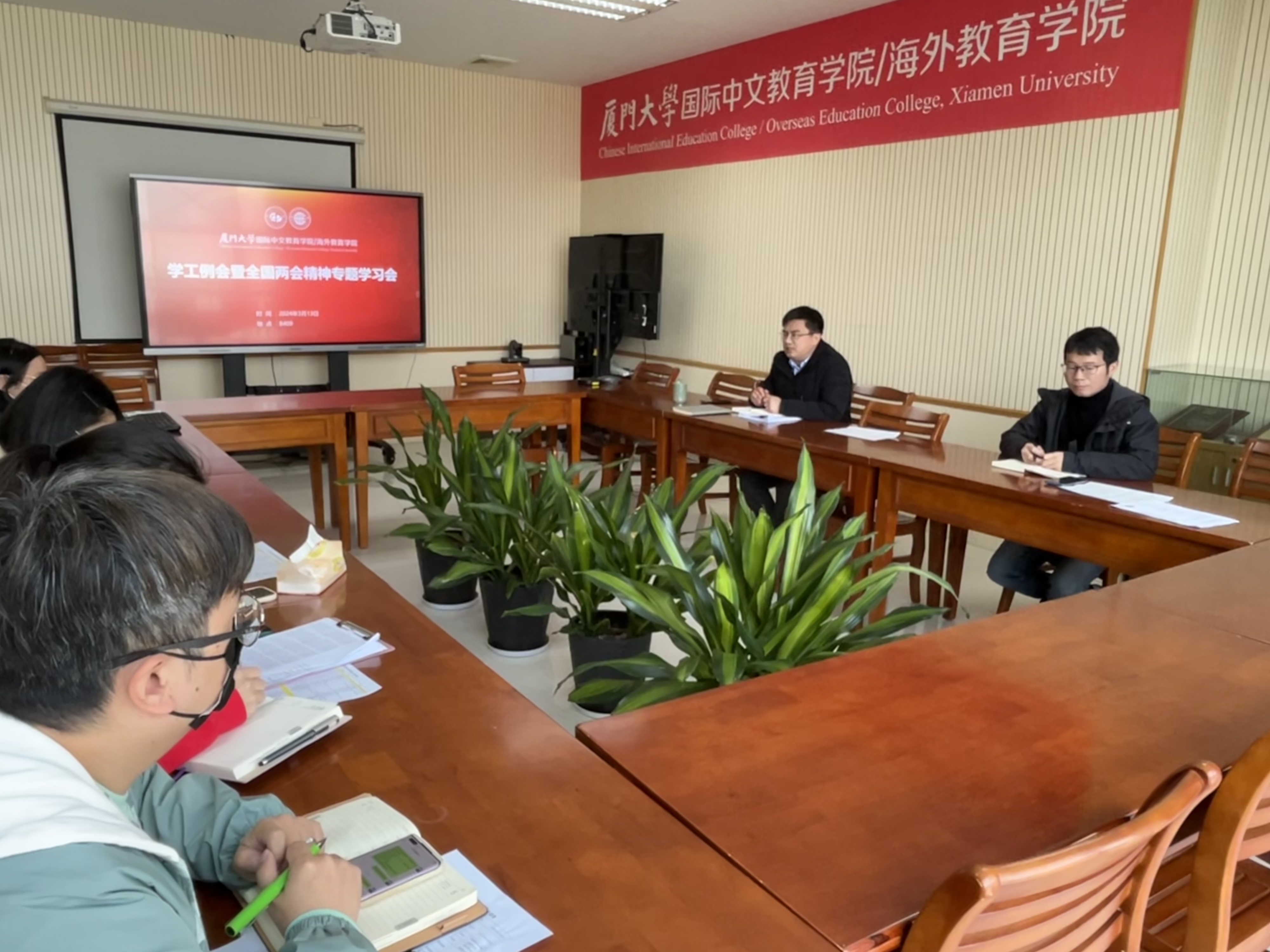 为深入学习贯彻落实2024全国两会精神,国际中文教育学院/海外教育学院分别召开学工组、学生骨干学习全国两会精神专题会,传达两会精神,凝聚奋进力量。
