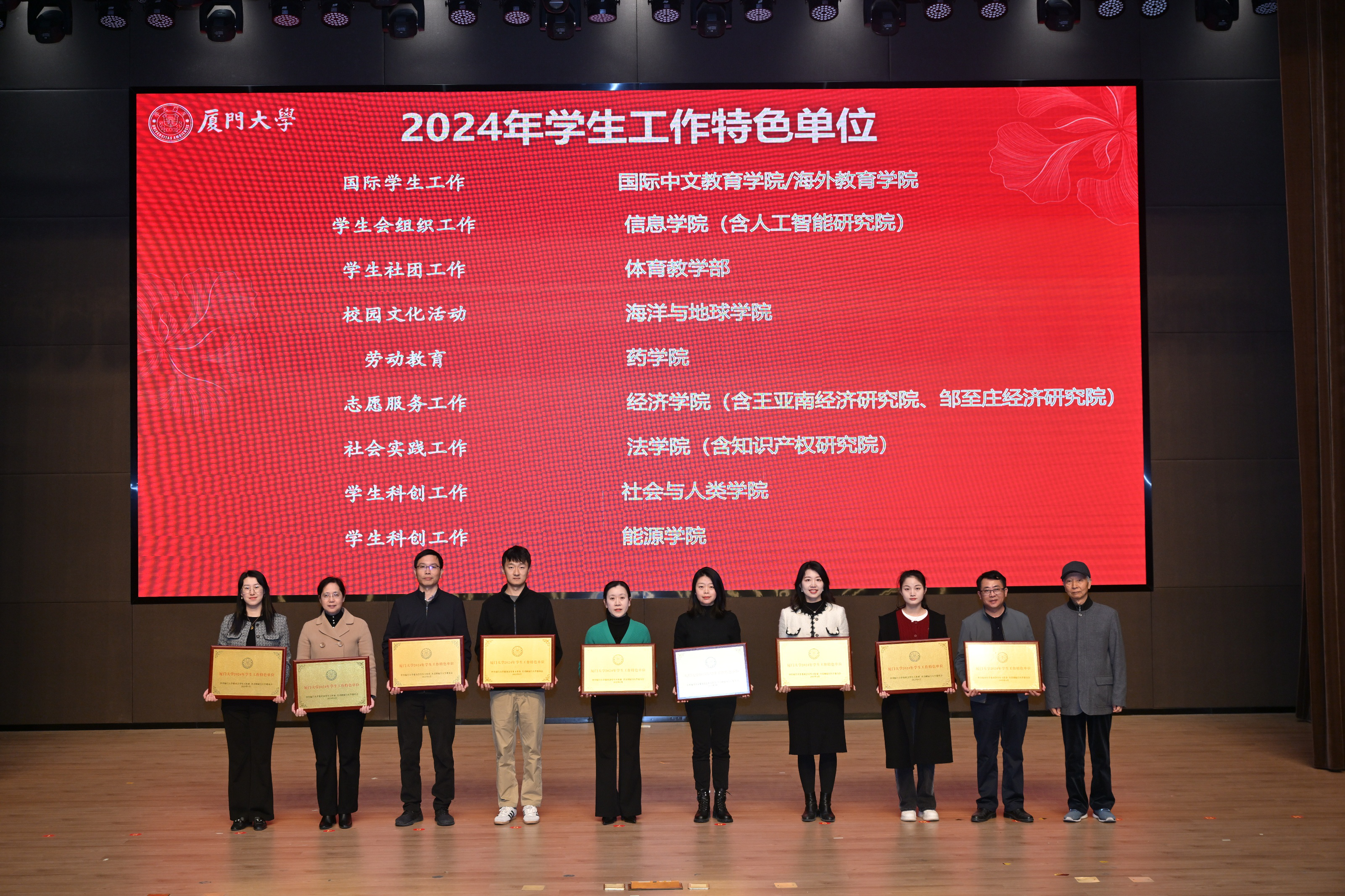 1月11日,厦门大学2024年学生工作总结研讨会在翔安校区举行。大会总结学校2024年学生工作的成绩和亮点,分享重点及专项工作经验做法,并对2024年学生工作先进单位、特色单位和优秀辅导员进行表彰。国际中文教育学院/海外教育学院荣获“网络育人工作”和“国际学生工作”两项“学生工作特色单位”,两位学生兼职辅导员考核“优秀”。