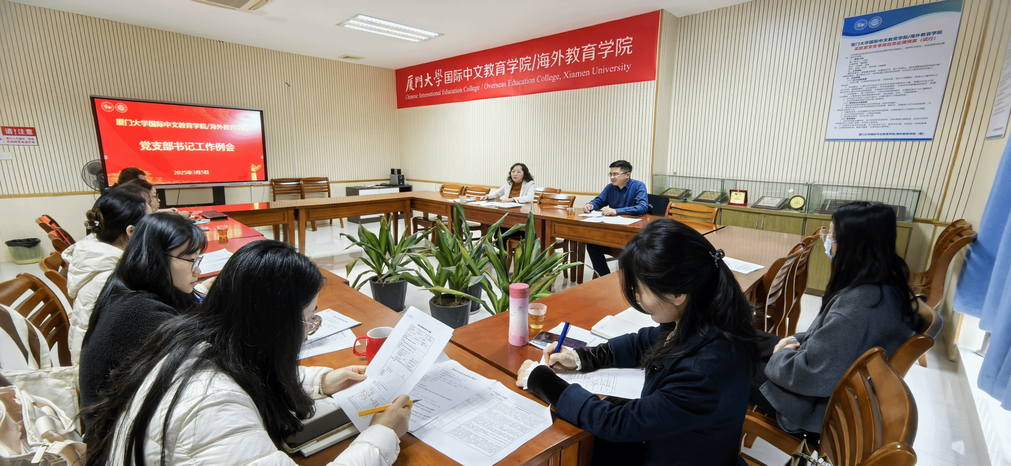 3月5日下午,国际中文教育学院/海外教育学院党委在坤銮楼B409会议室召开2025年新学期党支部书记工作例会。学院党委书记许美霞、党委副书记林明华,各党支部书记、委员等参加会议。