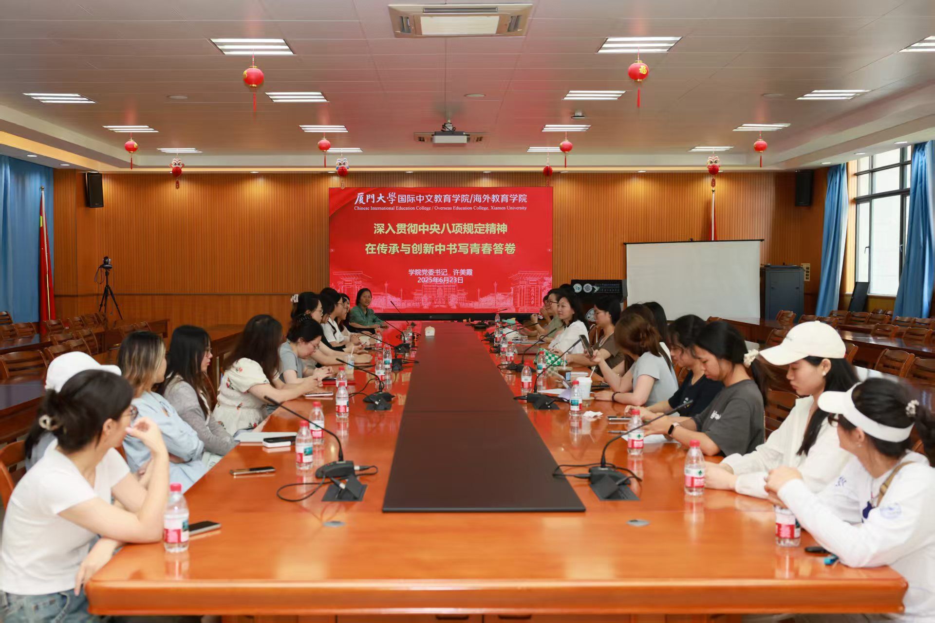 为深入学习贯彻习近平总书记关于党的建设的重要思想,扎实开展深入贯彻中央八项规定精神学习教育,引导毕业生党员坚定理想信念、牢记初心使命、强化身份意识,6月23日上午,国际中文教育学院/海外教育学院党委在翔安校区坤銮楼C104会议室举行2025届毕业生党员教育大会暨深入贯彻中央八项规定精神学习教育专题党课。学院党委书记许美霞以《深入贯彻中央八项规定精神 在传承与创新中书写青春答卷》为题,为全体毕业生党员和积极分子上了毕业前“最后一堂党课”。