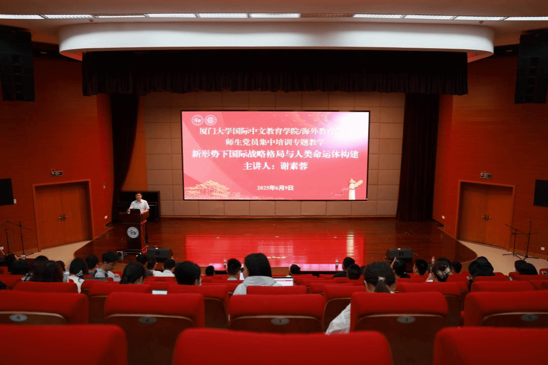 为深入贯彻落实习近平新时代中国特色社会主义思想和党的二十届三中全会精神,扎实推进深入贯彻中央八项规定精神学习教育,落实师生党员基本培训工作,加强党员党性修养,提升党员教育培训工作实效,6月9日下午,国际中文教育学院/海外教育学院党委在翔安校区坤銮楼B102报告厅开展师生党员基本培训专题教学。马克思主义学院军事教研室主任谢素蓉副教授应邀做题为《新形势下国际战略格局与人类命运共同体构建》的专题报告。国际中文教育学院/海外教育学院党委副书记林明华主持,全院师生党员参加。