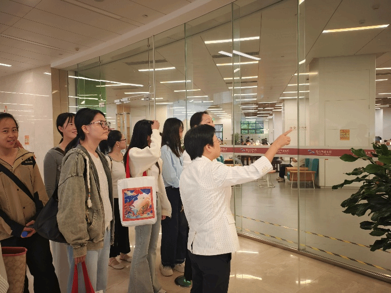 在厦门市图书馆副馆长池莲香的带领下,师生党员们依次参观了少儿分级阅读区、多功能报告厅、影音体验室等特色功能区,深入了解了新城馆区在智能化文献借阅、信息检索等方面提供的先进便民服务,亲身感受了现代科技为传统图书馆运营与服务模式带来的深刻变革与全新活力。