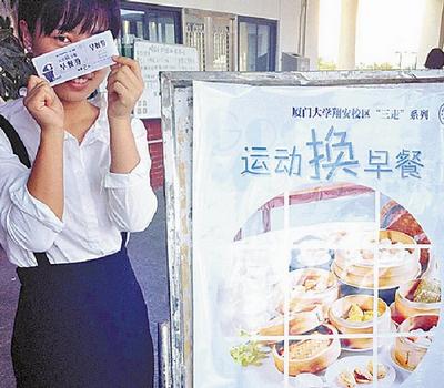 早上6点半,在厦大翔安校区竞丰食堂门口排起一队长龙,跳绳、踢毽子、颠排球,学生们运动完开开心心换一张2元早餐券。最近,这项“运动换早餐”的活动在厦大翔安校区受到学生追捧。