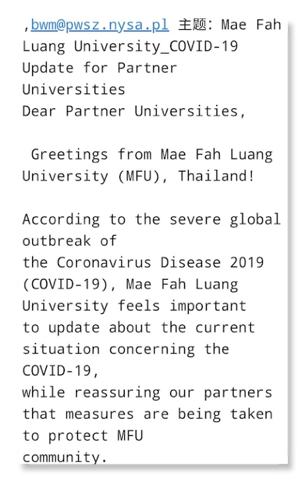2020年3月12日,泰国皇太后大学,就新型冠状病毒肺炎疫情在泰国的最新发展情况致信我院,皇太后大学在信中表示:“亲爱的合作伙伴院校,根据全球爆发严重的新型冠状肺炎病毒疫情,皇太后大学感到有必要提供当前关于新型肺炎疫情的最新情况,同时向我们的伙伴院校保证采取有效措施来保护皇太后大学校园社区。学生和教职员的健康和安全一直是我们的首要任务,皇太后大学积极且严格地执行了监测和预防新型冠状病毒肺炎疫情疾病传播的措施,包括取消活动、推迟出国旅行,并提倡勤洗手、生病时远离学校。在此,我们想强调的是,目前泰国皇太后大学还没有出现确诊的病例,有关皇太后大学如何应对新型冠状病毒肺炎疫情暴发的进一步信息,以及最新的健康指南和其他信息,请查看我们的网页或社交媒体,该网站定期更新。皇太后大学将持续监控疫情情况并向您提供最新信息。如果您或您的学生有任何其他问题,请联系全球关系部邮箱global@mfu.ac.th。”