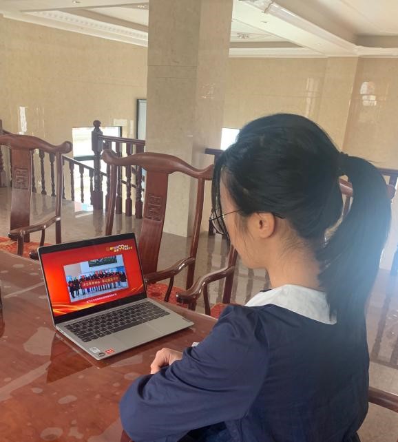 (院长陶涛、党委书记王艺、党委副书记罗俊峰与海外籍学生一起观看校庆直播)