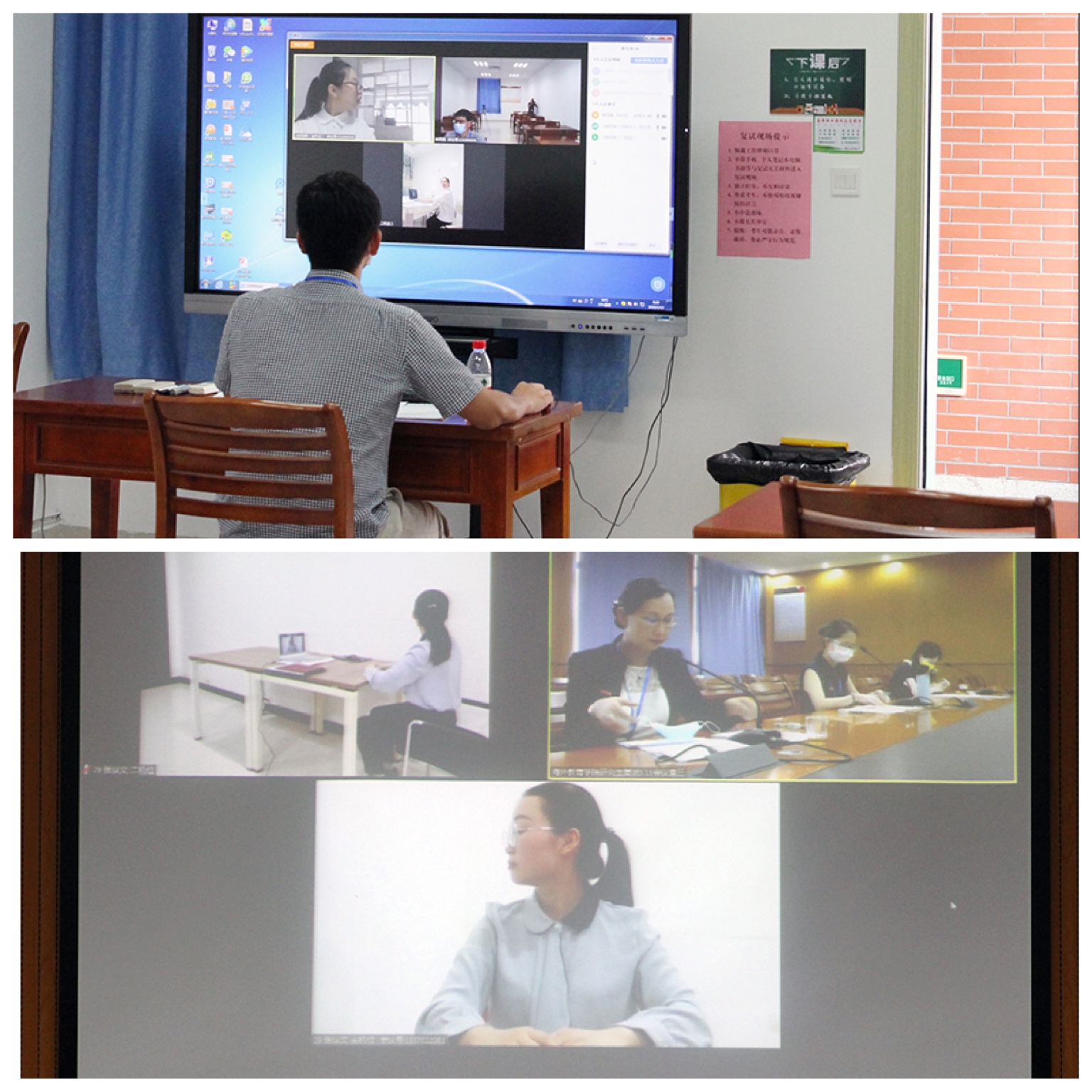 考生以线上抽签的顺序依次进入考场,先后需进行思想政治素质和品德考核、外语面试、专业知识、综合素质和能力测试等,每场会议室均安排3-6名面试考官,配备技术人员、复试秘书及工作人员。复试流程严格按照学校考试规范进行,包括学生自我陈述、随机选择考题、专家问答、评议等环节,复试全程考生始终保持注视摄像头,避免考生查阅资料、替考作弊等行为,复试过程全程录像,督查小组老师严格巡视,保证了远程复试操作的规范性和公平性。