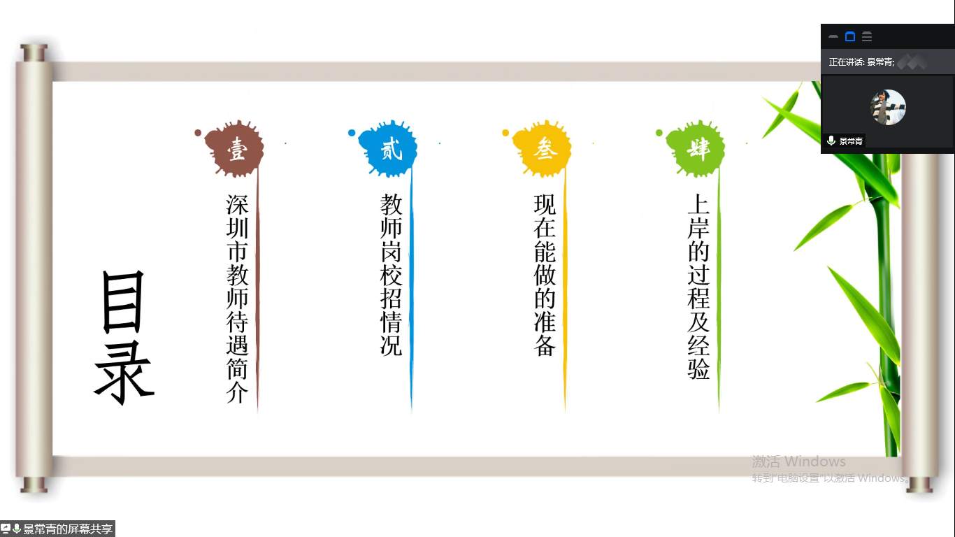 第三位是成功上岸深圳编制教师的景常青同学。景同学先是展示了深圳的“诱人”的福利待遇,接着介绍了深圳市教师岗校招的情况。她建议同学们要多实习,并做好知识储备。她重点分享了自己的上岸过程及经验,考试分为资格审查、面谈考察、结构化面试三个阶段,景同学认为资格审查是展示自我的机会,因此要勇于自我推销,保持自信。此外,信息的及时更新和朋友家人的鼓励也是极为重要的。