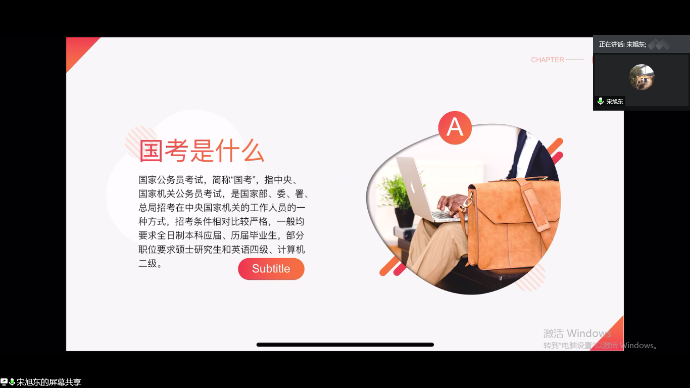 接下来上场的是国考“大神”——宋旭东同学。宋同学在2019年的国考中取得了148的高分,解起题来可谓是游刃有余。宋同学分享了行测和申论的解题技巧及需要保持的心态,并给出了一些例题帮助同学们更深入理解。他提到时间是挤出来的,需要合理规划,先夯实基础,继而题海打磨,最关键的是一定要总结。