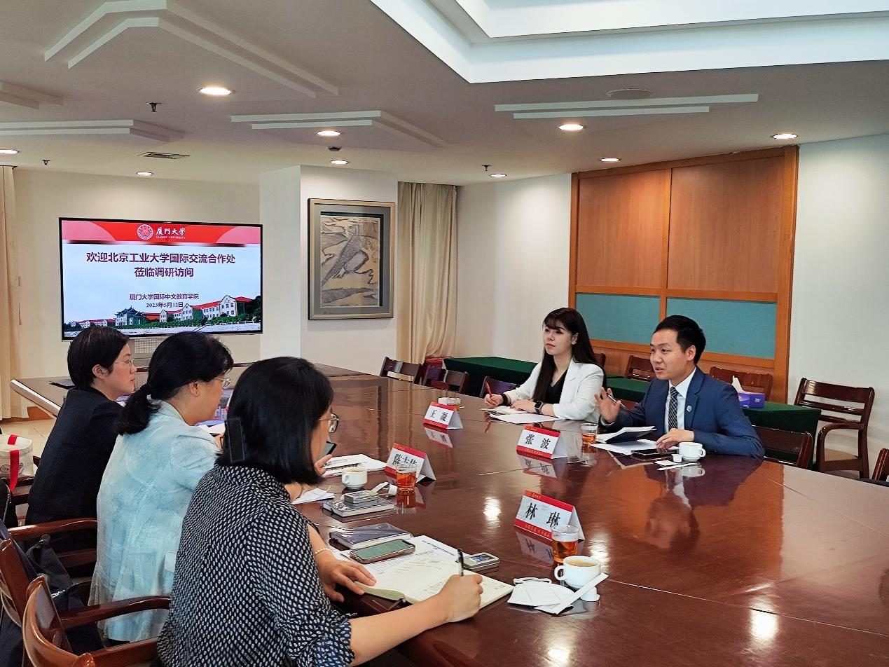 5月12日,北京工业大学国际交流合作处副处长张波、国际交流合作处一带一路办公室主任王凝来校调研,期间与国际中文教育学院/海外教育学院院长陈志伟、副院长潘超青、语合中心副主任何冬梅、林琳等,围绕国际中文教育和孔子学院工作相关情况进行座谈交流。