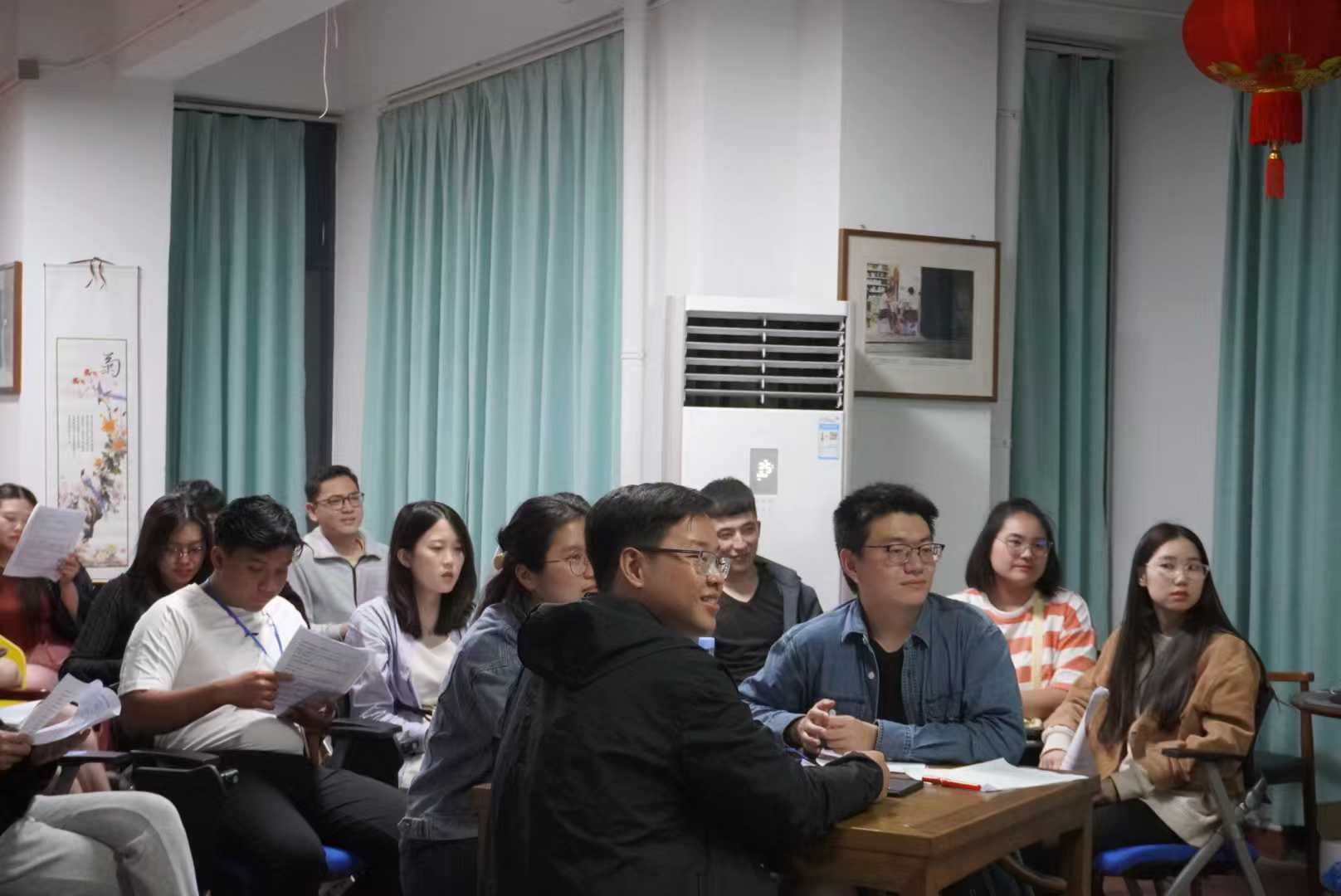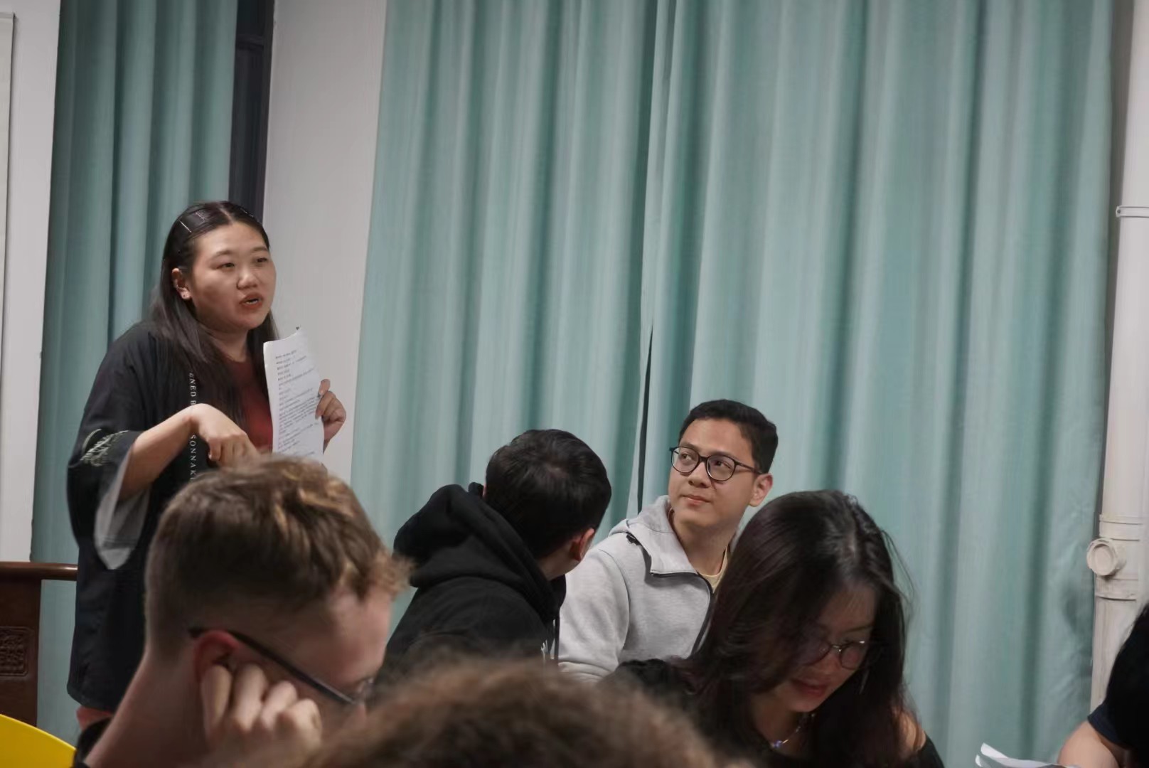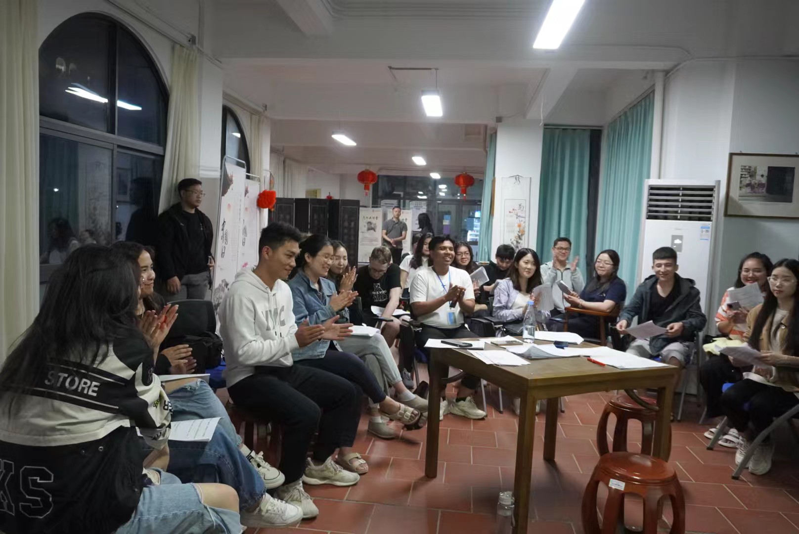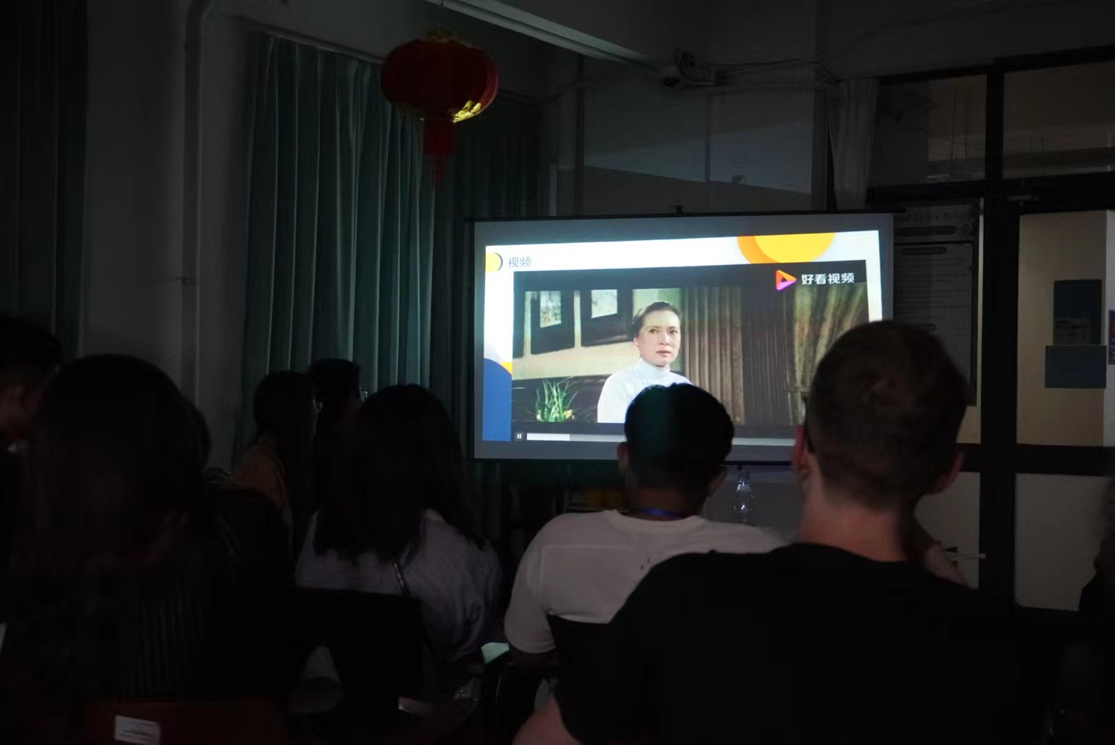 示范围读的四名同学分别是:洪珍永(韩国)、刘安琪(印度尼西亚)、陈奕桦(印度尼西亚)和孙昊泽(中国)。通过他们的对话,演绎了周鲁间的爱恨情仇,在场同学们纷纷沉浸其中。之后是分组围读环节,同学们自由组队,读得都很投入,读书、品书的气氛十分浓厚。接下来是放映《雷雨》片段,著名演员的精彩表演加深了同学们对剧本的理解,纷纷表示故事很震撼,之后会读完并观看话剧演出视频。