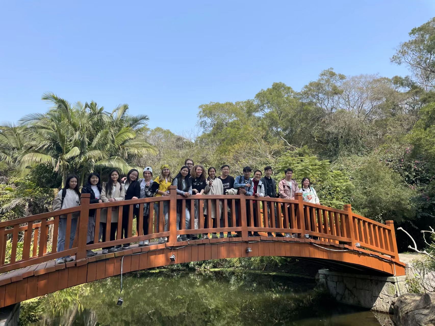 之后,大家登上了思源谷。迈进山路,来到一方世外桃源,这里傍山依水,草木葱郁,偶有几处亭台水榭,行于此间,不禁心旷神怡。行至一处窄桥,大家一同合影留念,不同的肤色在此刻交融,大家在嬉笑声中结束了今日的旅程。