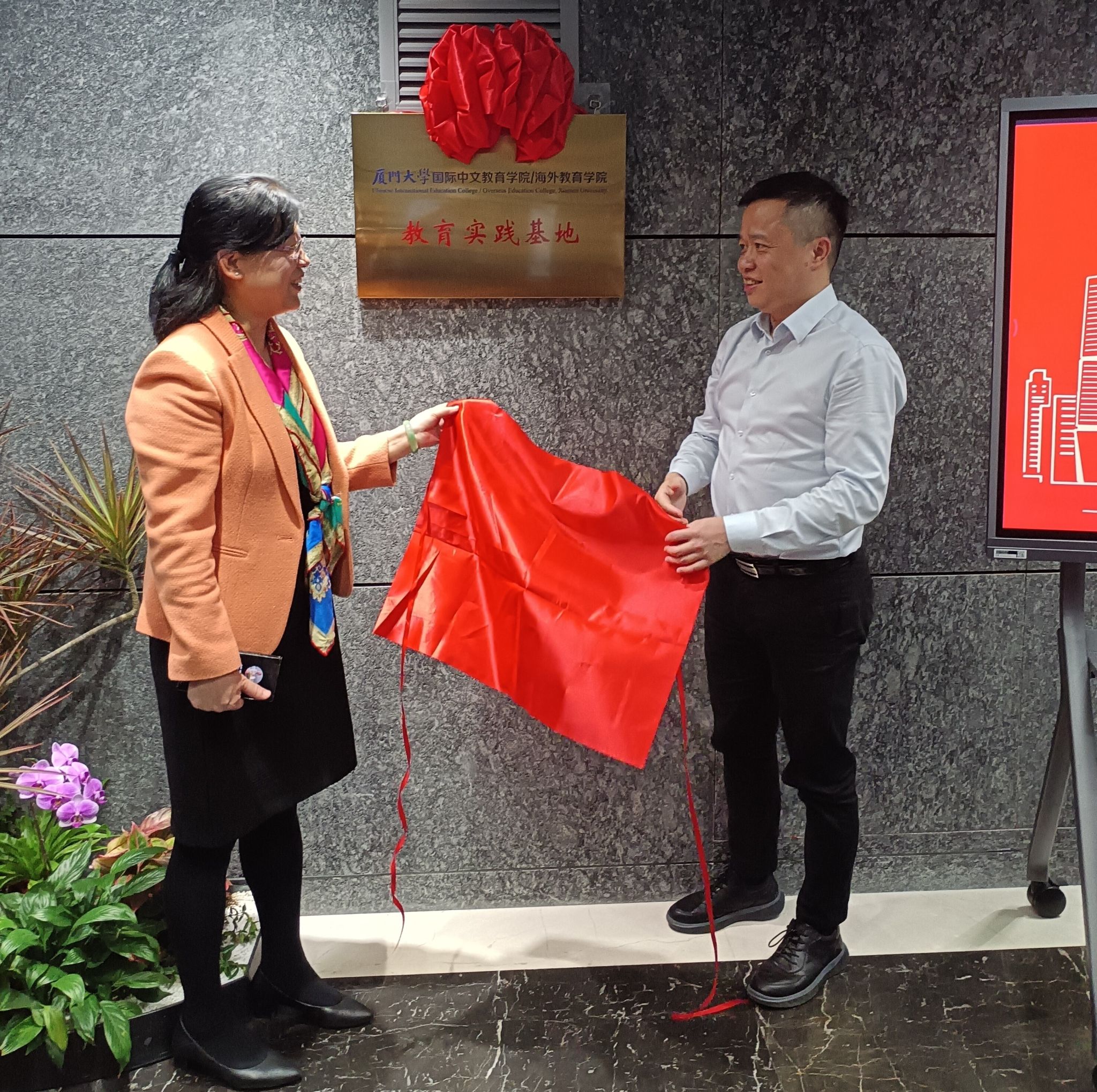 双方就共建教育实践基地、构筑实习实践平台等合作事宜达成合作框架,签署了共建“厦门大学国际中文教育学院/海外教育学院教育实践基地”合作协议,并举行“厦门大学国际中文教育学院/海外教育学院教育实践基地”揭牌仪式。