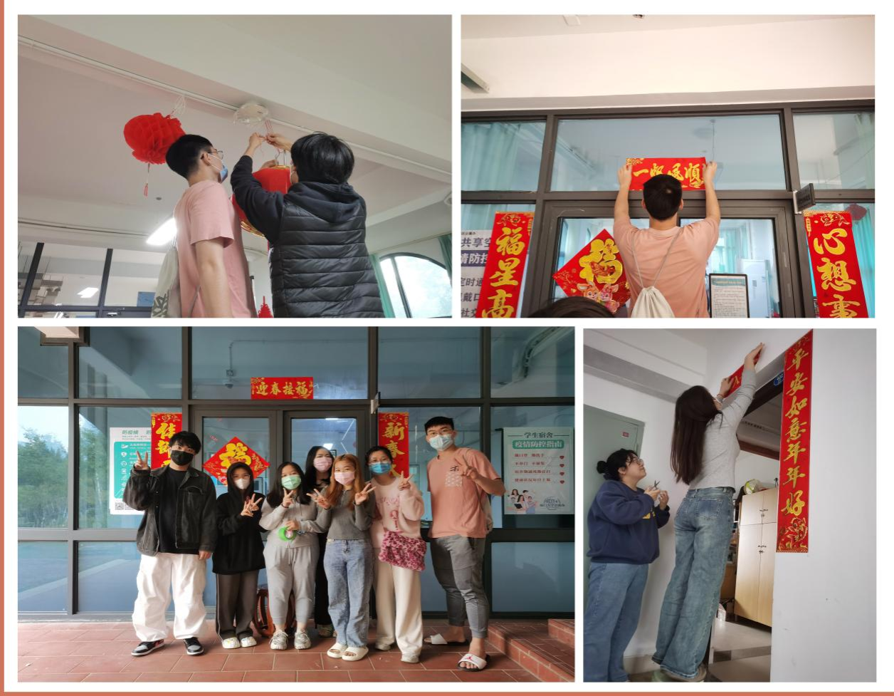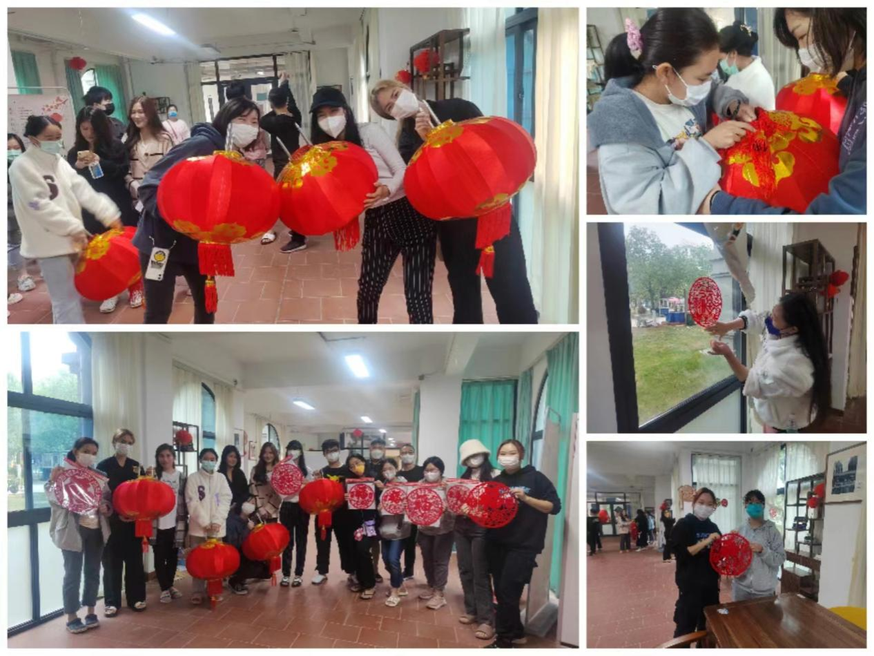 中华文化体验室有很多中国装饰品,如屏风、脸谱、书画、毽子等等。新春临近,为了让空间更具年味,两名老师和中国学生,一边讲解春节习俗,一边与国际学生一起贴春联、粘窗花、挂灯笼。不一会儿,中华文化体验室就被星星点点的中国红点亮了,年味十足,焕然一新。之后,学院还为留校学生送上零食、春联和福字等慰问品,让同学们感受到了关怀和温暖。
