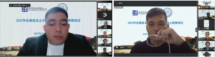两位参训教师代表发言。来自越南胡志明市财经大学的武兴在发言中,表达了对组织单位厦门大学的感谢,他表示本次培训设置的课程涵盖面广,针对性强,让他开阔了眼界、增长了见识,也提升了自身的中文教学能力与职业素养;来自菲律宾碧瑶爱国中学的李金光对培训老师及工作人员表示感谢,感谢大家两个星期以来的陪伴、关心与照顾,他认为此次培训他收获满满,也希望将来有机会能到厦门大学进行线下的交流学习。