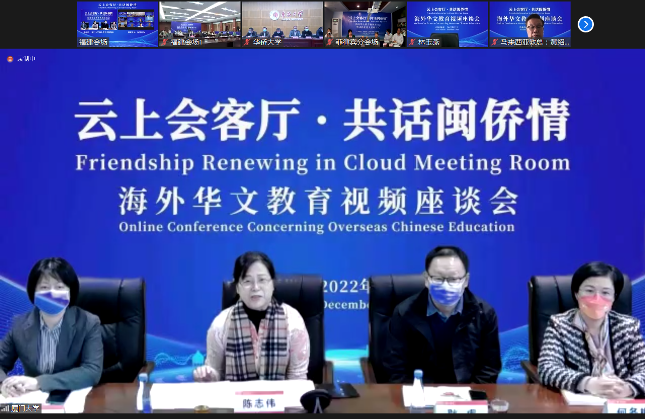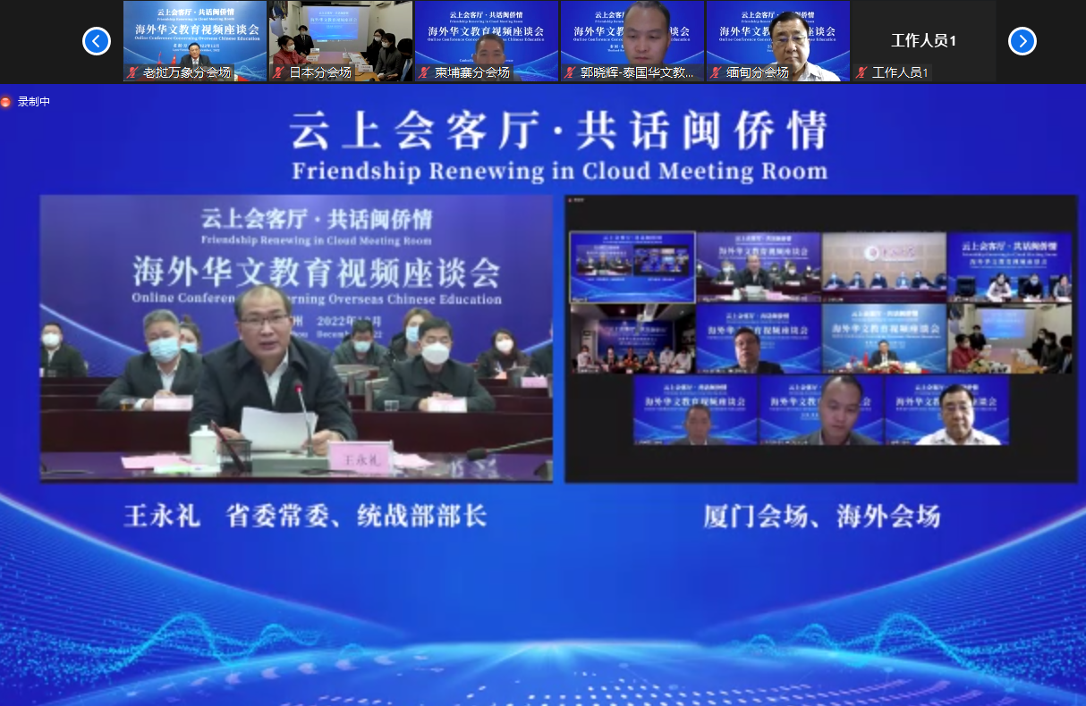 2022年12月19日,第三期“云上会客厅·共话闽侨情”海外华文教育视频座谈会顺利举行,厦门大学国际中文教育学院/海外教育学院院长陈志伟、副院长耿虎、副院长潘超青、语合中心副主任何冬梅通过线上形式参会。福建省委常委、统战部部长王永礼出席并讲话,福建省委统战部副部长肖华鑫、省教育厅副厅长王飏、华侨大学党委书记徐西鹏等有关单位负责同志,以及菲律宾、马来西亚、泰国、缅甸、老挝、柬埔寨、日本等国有关华教组织、华校负责人,福建省华文教育基地、外派华文教师代表等共80余人,以线上或线下形式参加会议。