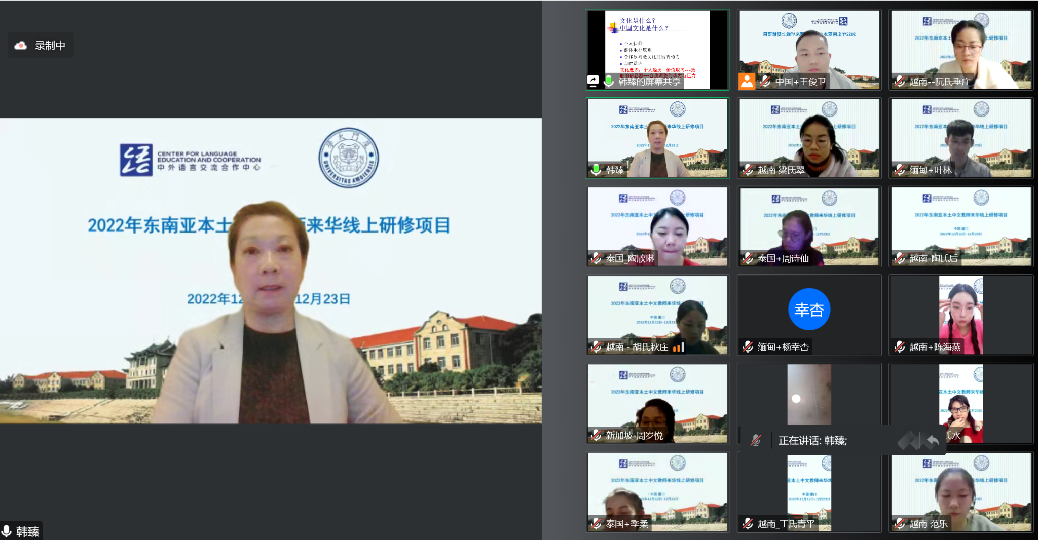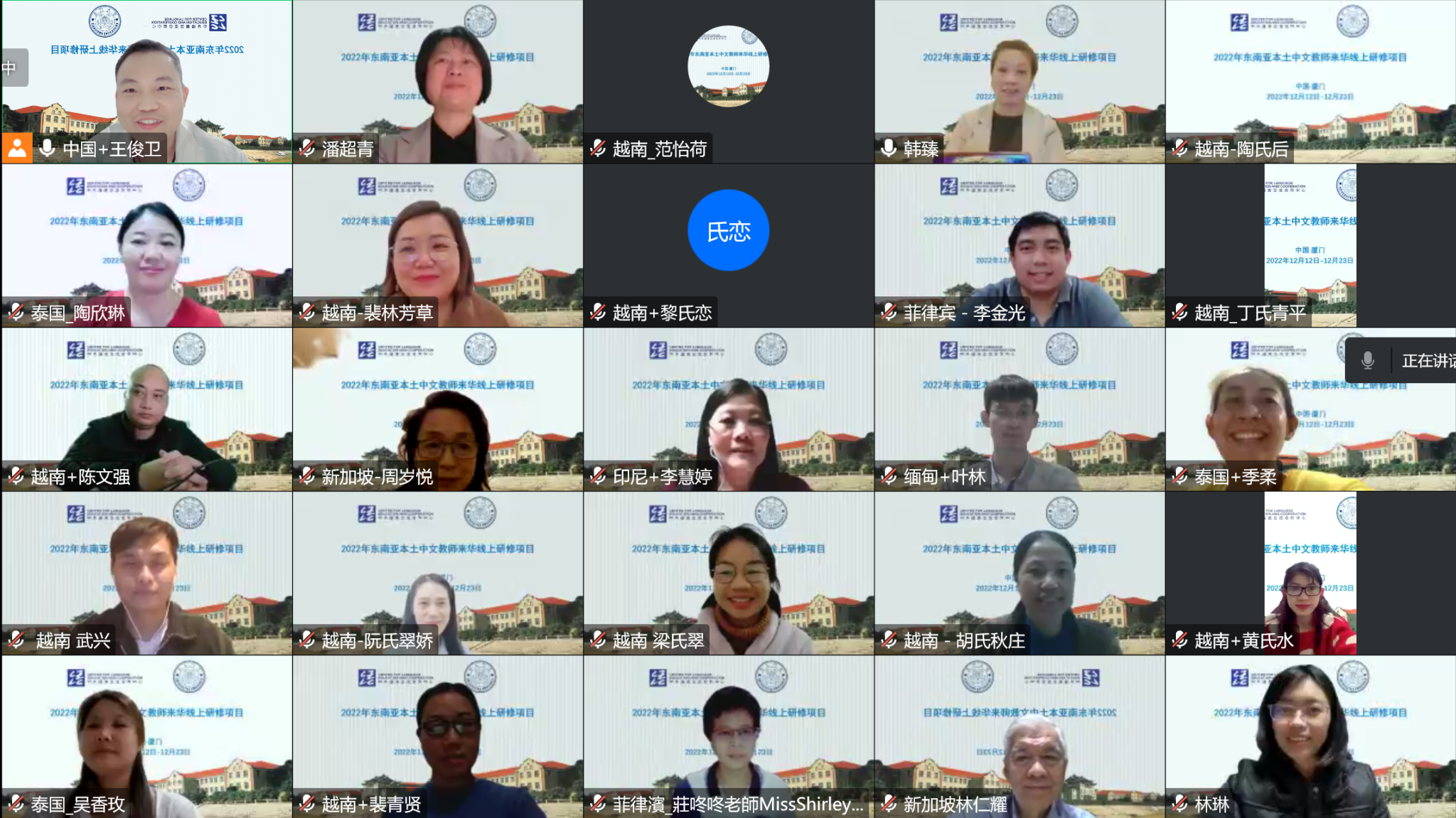12月12日晚,由教育部中外语言交流合作中心主办、厦门大学国际中文教育学院/海外教育学院承办的“2022年东南亚本土中文教师来华线上研修项目”顺利开班。
