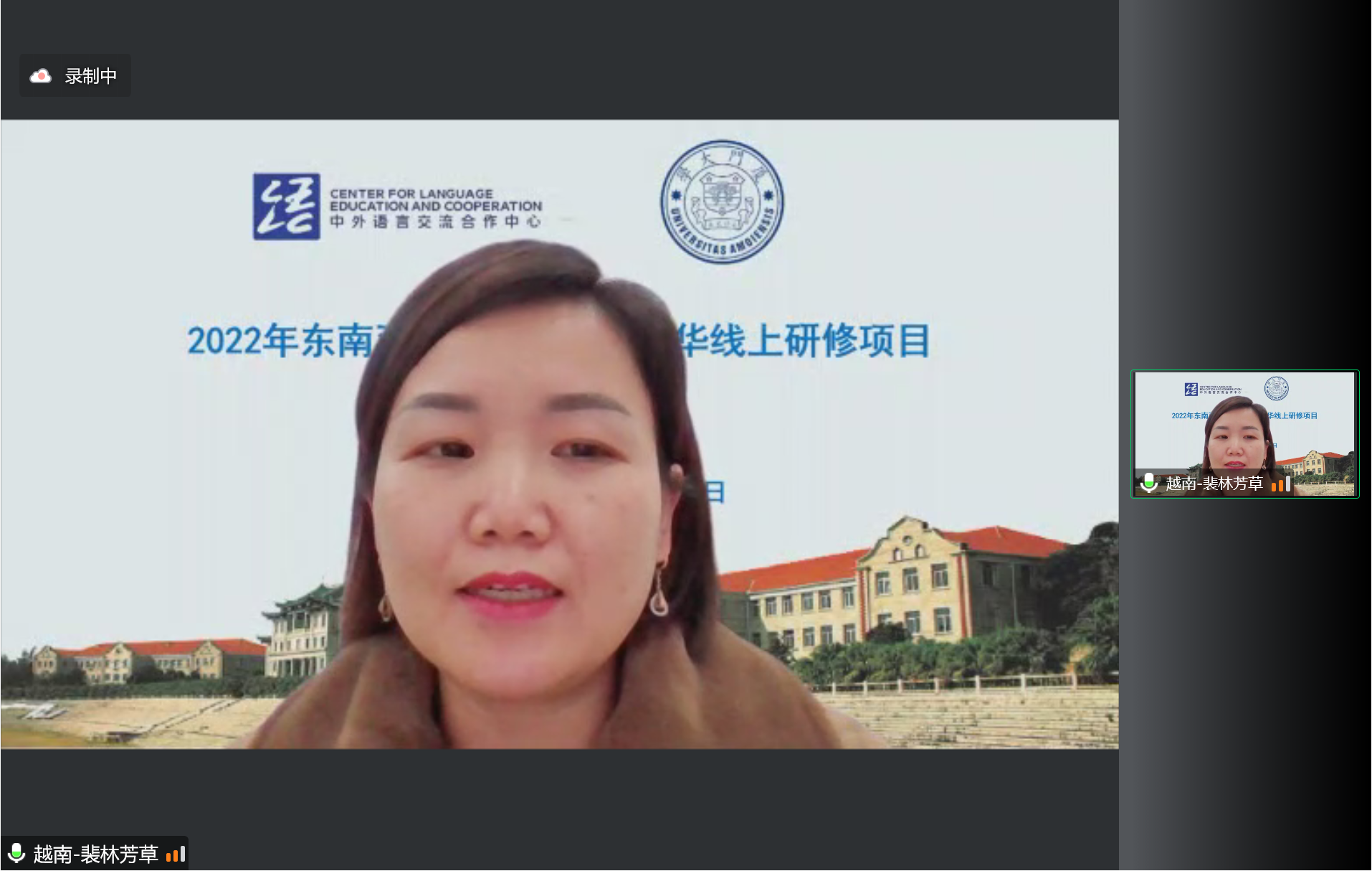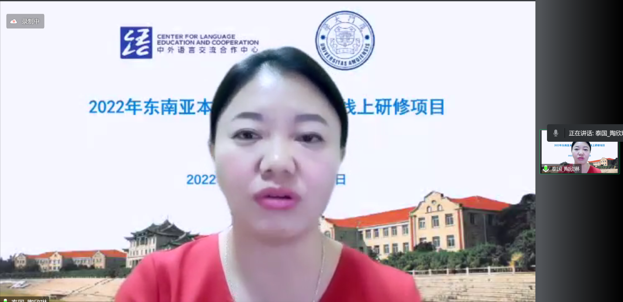 厦门大学国际中文教育学院/海外教育学院副院长潘超青、厦门大学中外语言交流合作中心副主任林琳、八位资深授课老师以及来自泰国、越南、缅甸等东南亚地区的一百余位本土中文教师参加了本次开班仪式,开班仪式由本次研修班班主任王俊卫主持。大家齐聚云端,首先观看了厦门大学的介绍视频,制作精良的宣传视频为学员们呈现出一个多面立体的厦门大学,为本次研修班拉开了精彩的序幕!
