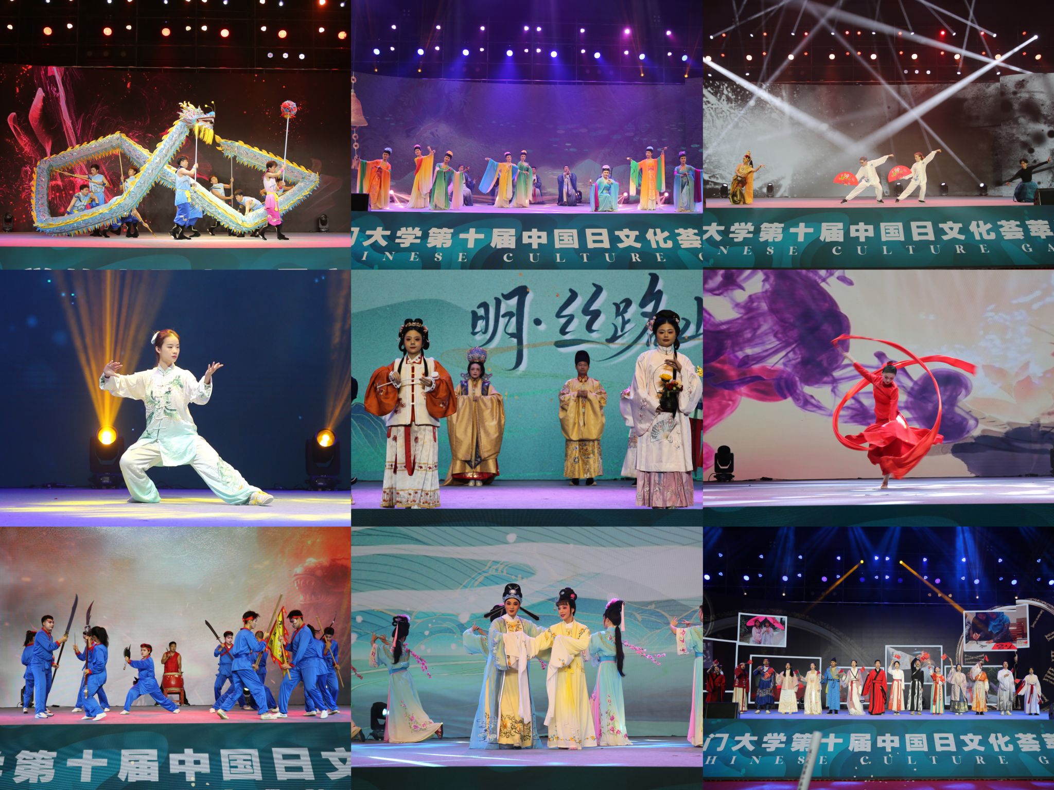 本次文化荟萃联合会在传承中国传统文化表演的同时,也融入了“闽文化”的元素,让海内外师生有更为真切的文化体验。古筝合奏《行者》带领观众重踏古丝绸之路,追寻消失于沙漠的绿洲古国;杖头木偶戏《梁祝》用纤细的提线木偶将不朽的爱情故事娓娓道来;《三国舞艺》是三个国家文化的碰撞,更是文化的相互融合;《朝代汉服秀》中外师生带领观众穿梭于汉唐宋千年历史间;《和合共生》体现了中华民族“尚和合,求大同”的价值追求;《中国南音》《南音随想》展示了千年古乐的魅力;《欢乐的节日》给大家带来一场视觉盛宴;歌仔戏《踏春》让观众领略闽南乡音与古言遗韵相融合的雅致美感;《宋江阵》以武会友,传承传统武术精神;留学生校友吴雨翔的对谈以外国人的视角探查中国细微处的文化;最后,中外学生合唱《瀚宇之花》,此时屏幕中让人惊喜地出现了2013年以来十届中国日的一桢桢往日画面,十年历程尽在眼前,“中国日”总导演肖宁遥老师表示希望以此形式兑现旧日承诺让正在世界各地的往届同学共赴“中国日”十年之约。