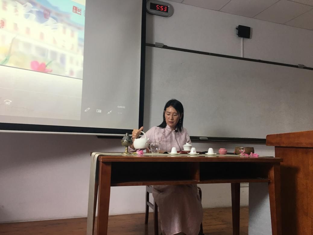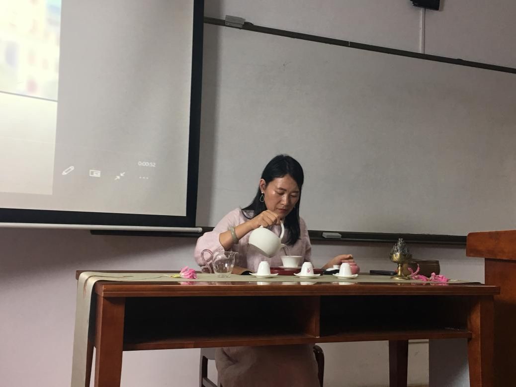 以茶修行,明心见性。活动伊始,赵英老师先为同学们带来茶文化相关知识介绍。赵老师是厦门大学国学茶士研修项目负责人、凤凰白鹭品牌创始人、人文茶修倡导者,在茶文化方面颇有研究。她从茶的养生功用、文化特质等角度深入浅出地对茶的知识进行讲解,并通过联系与茶相关的历史人物,展示皎然和尚、苏轼等爱茶名人独特有趣的一面。此外,赵老师还结合自己的生活体验,为大家揭示茶背后蕴藏的中国传统哲学与养生观念。