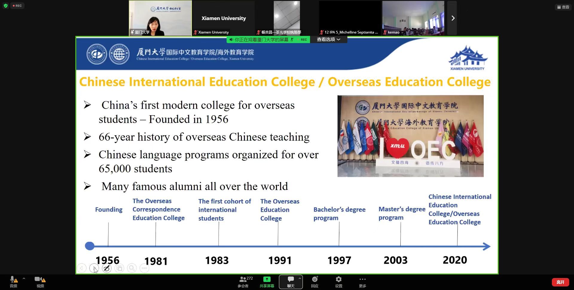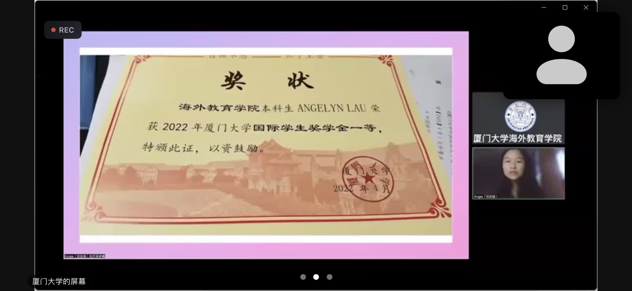 在交流分享环节,我院印尼留学生代表刘安琪也介绍了自己在厦门大学的学习和生活经历,还特别给线上的印尼学子分享了自己获得国际学生一等奖学金的经验。
